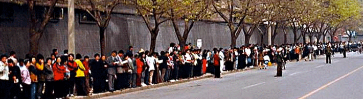 Latar Belakang: Pada tanggal 23 & 24 April 1999, petugas kepolisian di Tianjin, sebuah kota dekat Beijing, menyerang dan menangkapi puluhan praktisi Falun Gong yang berkumpul di luar kantor majalah untuk mendiskusikan kesalahan dalam sebuah artikel yang menyerang Falun Gong. Ketika berita penangkapan menyebar dan semakin banyak praktisi Falun Gong bertanya pada para pejabat berwenang, diberi tahu bahwa mereka harus mengajukan permohonan ke Beijing. Hari berikutnya, 25 April, sekitar 10.000 praktisi Falun Gong secara spontan berkumpul di kantor pusat urusan permohonan di Beijing, sesuai anjuran para pejabat di Tianjin. Kumpulan massa ini sangat damai dan tertib. Beberapa perwakilan Falun Gong diterima oleh Perdana Menteri Tiongkok, Zhu Rongji, dan anggota stafnya. Malam itu, keprihatinan para praktisi Falun Gong terjawab, para praktisi yang ditangkap di Tianjin dibebaskan dan semua orang pulang.