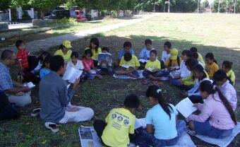 Di tempat yang tidak jauh dari tempat tersebut tampak dua puluhan lebih anak-anak Minghui School Bali dengan serius belajar Fa bersama, mereka dibimbing oleh dua orang guru Minghui School. Mereka dibimbing untuk belajar Fa, Fa Zheng Nian dan Klarifikasi. Disamping itu mereka juga diberikan cerita-cerita untuk meningkatkan Xinxing, melukis, menyanyi dan baca Hong Yin. Mereka dengan bersemangat dan gembira belajar bersama di udara bebas.