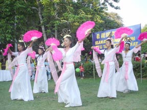 Beberapa lagu seperti “Wei Ni Er Lai,” “Shifu, Xie Xie Nin,” dan “Falun Dafa Hao” juga dinyanyikan oleh para praktisi dalam acara tersebut. Para penonton yang antusias memberikan tepuk tangan mereka di setiap akhir penampilan para praktisi.
