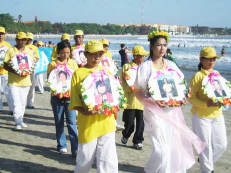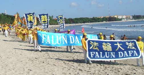 (Minghui.org) Pada hari Minggu tanggal 22 Juli 2007 sekitar jam 15.30 Wita, kurang lebih 300 praktisi Falun Dafa dari berbagai kabupaten di Bali tengah berkumpul di Pantai Kuta depan HardRock Café untuk melaksanakan serangkaian kegiatan dalam rangka mengklarifikasi fakta untuk mengekspos kejahatan Partai Komunis China (PKC) yang telah menindas Falun Gong selama 8 tahun sejak tanggal 20 Juli 1999.