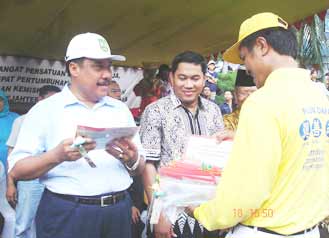 (Minghui.org) Walikota Kota Batam, Drs. Achmad Dahlan menerima ‘bingkisan’ bahan materi klarifikasi Falun Dafa di panggung kehormatan Pawai Budaya HUT RI ke – 62, yang diadakan oleh Pemerintah Kota Batam, pada Sabtu (18/8). ‘Bingkisan’ tersebut diberikan oleh Gatot, selaku koordinator peserta pawai dari Himpunan Falun Gong Indonesia Cabang Batam.