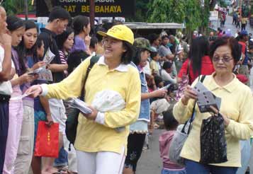Sejumlah praktisi lainnya aktif membagikan brosur Falun Dafa ke warga yang menonton pawai di tepian jalan. Beragam komentar dari warga terlontar karena keingintahuan mereka. “Apakah ini semacam praktek kesehatan, pengobatan alternative, terus apakah punya klinik pengobatan?” Ada pula yang mengatakan, “Oo ini yang kemarin konvoi mobil itu ya…? Yang ada spanduk Stop Penindasan Falun Gong itu.” Setelah mendapatkan penjelasan mereka dapat memahami kebenaran Falun Gong dan penindasan yang dialami praktisi Falun Gong di China.