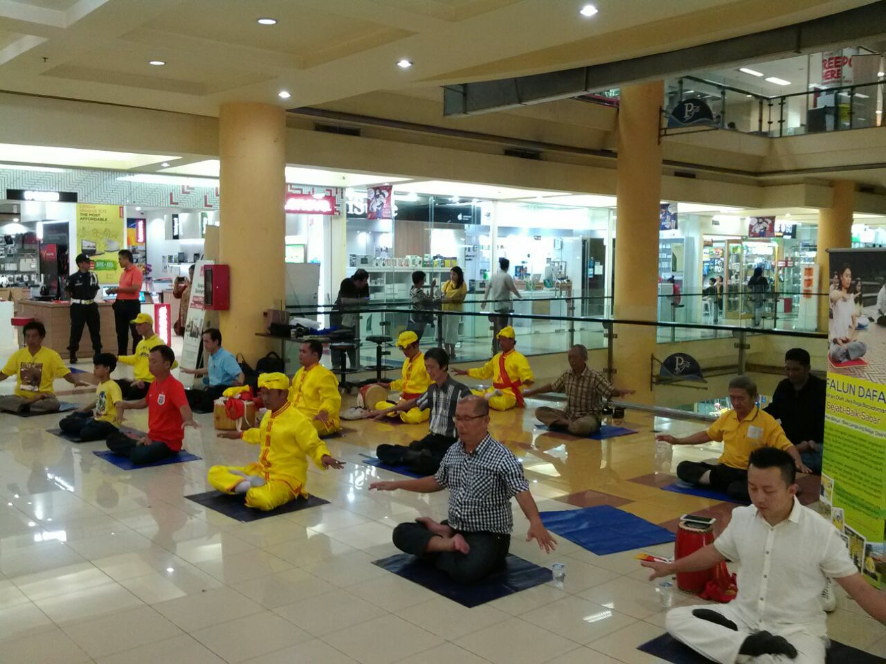 Selama sekitar dua jam, Barisan Genderang Pinggang praktisi Falun Dafa di Jakarta berkeliling mal tersebut dari lantai ke lantai, sementara para praktisi perempuan yang berkostum bidadari Tiongkok membagikan brosur dan lotus kertas buatan tangan yang berisi pesan kebaikan Falun Dafa dan prinsip dasarnya, Sejati-Baik-Sabar. Banyak pengunjung dewasa maupun anak-anak dengan gembira menerimanya sambil menikmati lagu-lagu yang dibawakan Barisan Genderang Pinggang.
