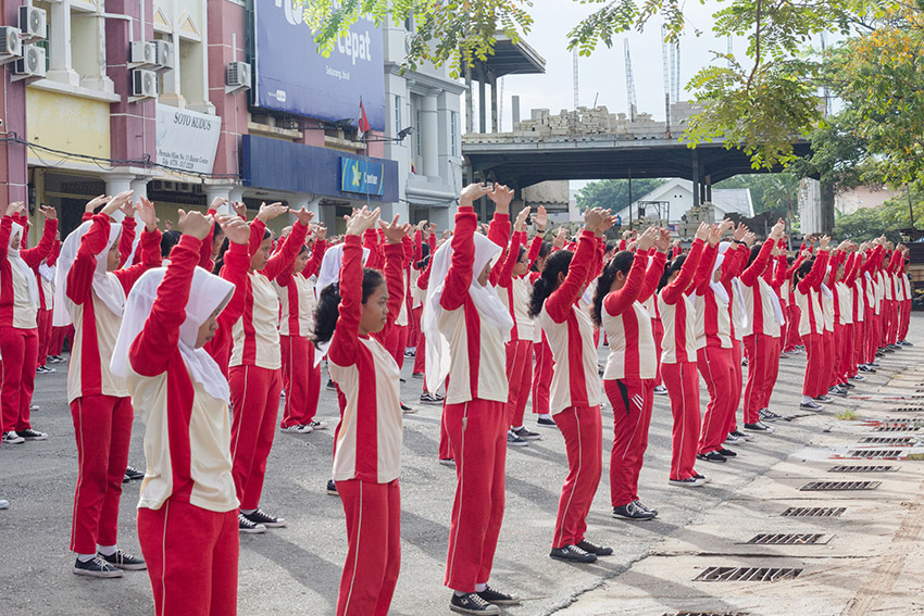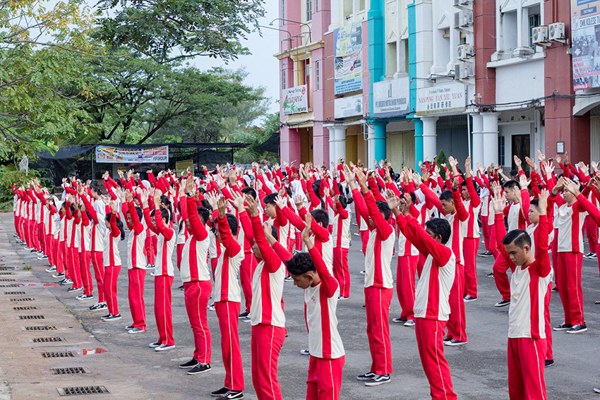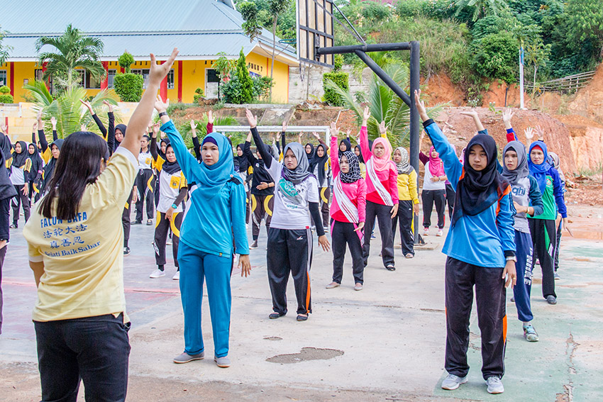 Para pelajar SMK Kolese Tiara Bangsa mempelajari latihan Falun Dafa