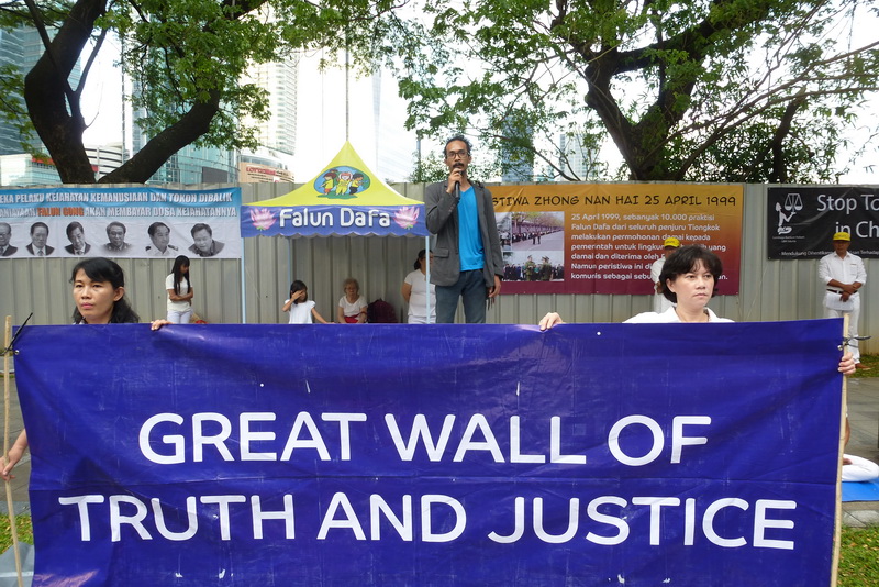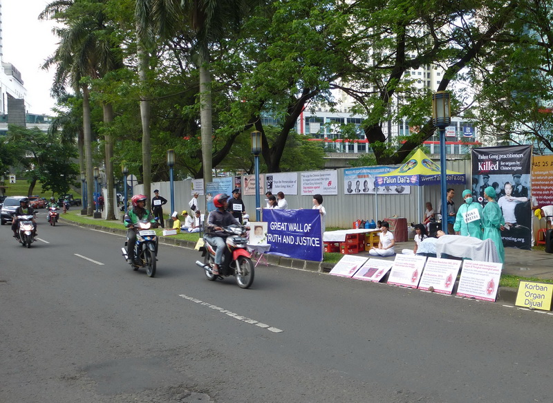 Kegiatan di depan Kedubes Tiongkok di Jakarta yang bertema ‘Tembok Besar Kebenaran dan Keadilan’ mengungkap fakta-fakta perjalanan Falun Gong dan penganiayaan yang dilakukan oleh PKT terhadap pengikut Falun Gong di Tiongkok, dengan tujuan agar semakin banyak warga Jakarta dapat mengetahui fakta kejahatan kemanusiaan yang dilakukan PKT dan memberikan dukungan moril mereka bagi penghentian penganiayaan tersebut. Puluhan warga yang melintas memberikan tandatangan mereka pada petisi yang melaporkan kejahatan kemanusiaan Jiang Zemin. Beberapa organisasi HAM seperti LBH, YLBHI, KontraS mengirimkan pesan dukungan mereka yang dibacakan pada saat orasi, sementara ketua Himpunan Falun Dafa Indonesia dan perwakilan dari Imparsial dalam orasinya menyerukan agar penganiayaan Falun Gong di Tiongkok segera dihentikan.
