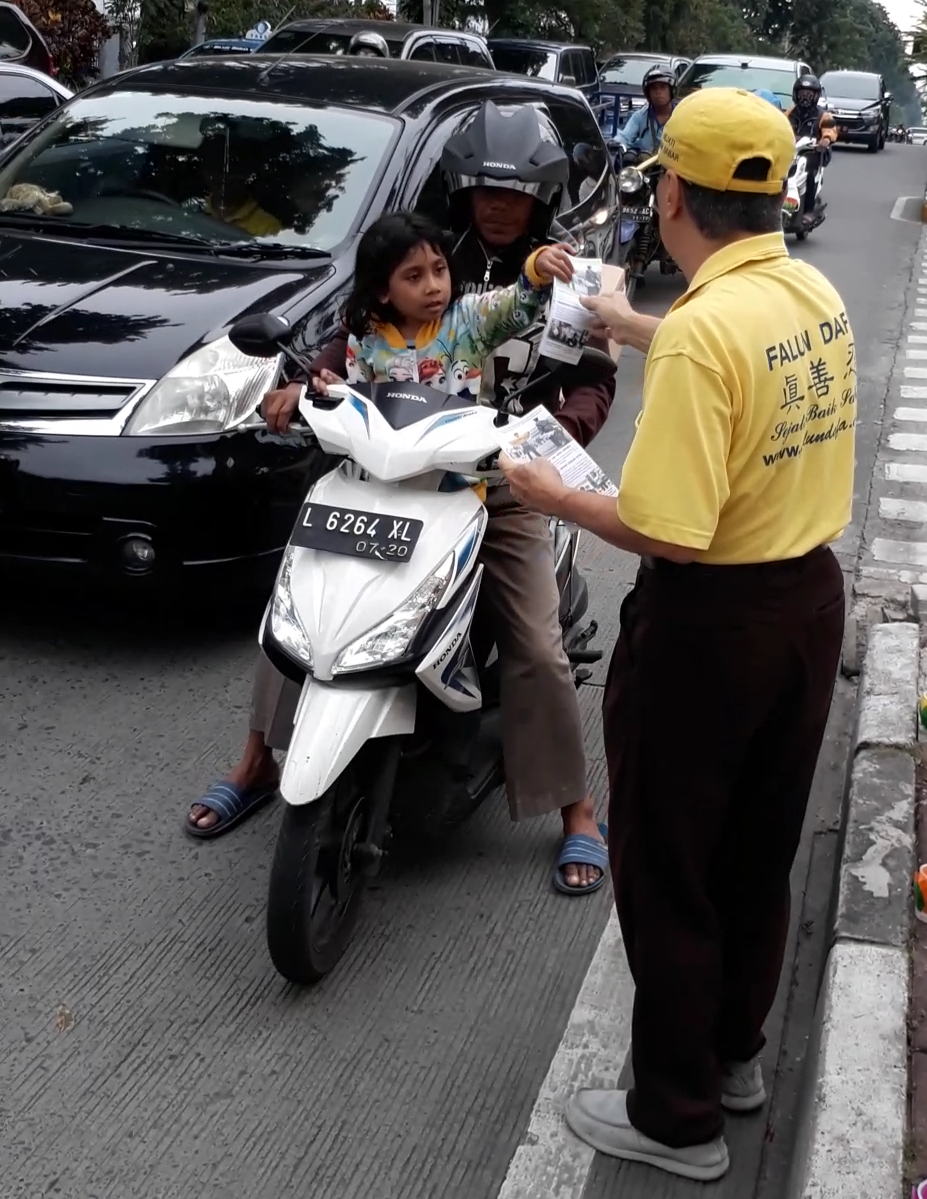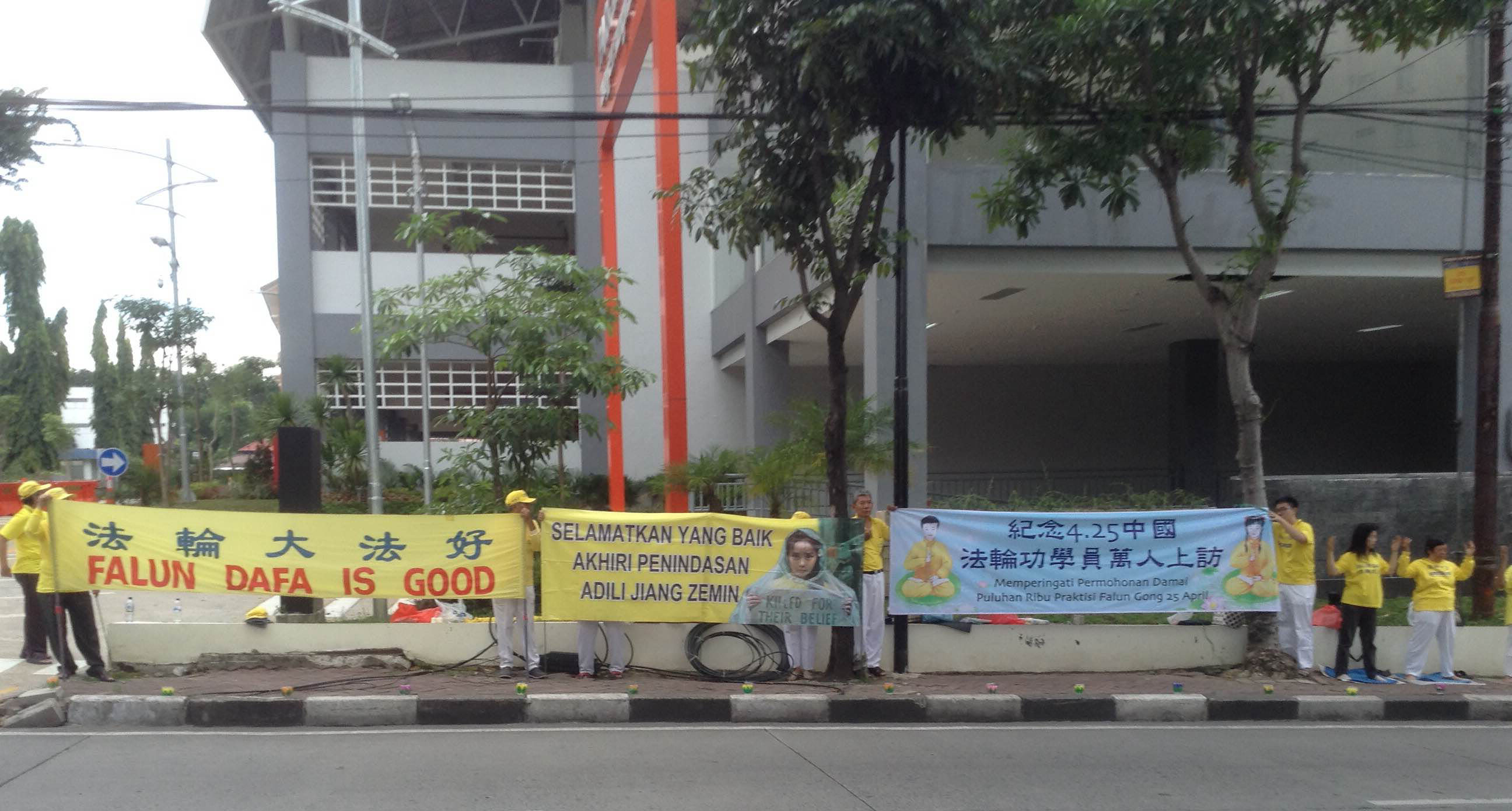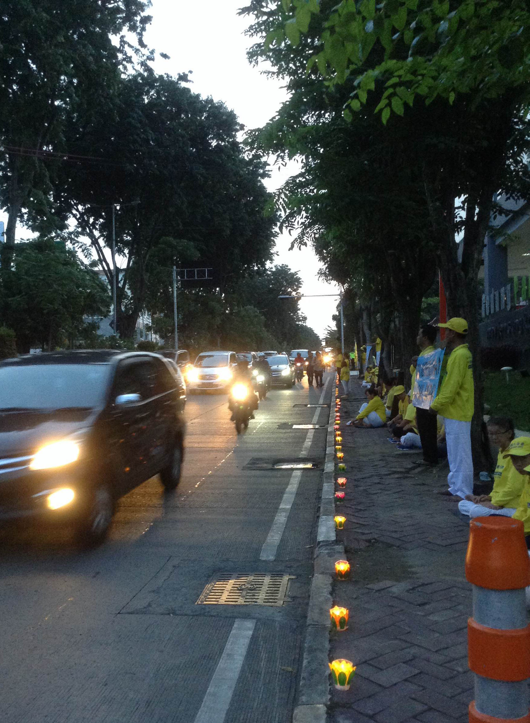 (Minghui.org) Sekitar 50 praktisi Falun Dafa dari Surabaya dan sekitarnya di Jawa Timur melakukan aksi damai di depan Konsulat Jenderal Tiongkok di kawasan Mayjend Sungkono, Surabaya, Sabtu (23/4). Kegiatan dimulai pada pukul 15.30 – 18.00, dalam rangka memperingati permohonan damai puluhan ribu praktisi Falun Gong pada 25 April 1999.