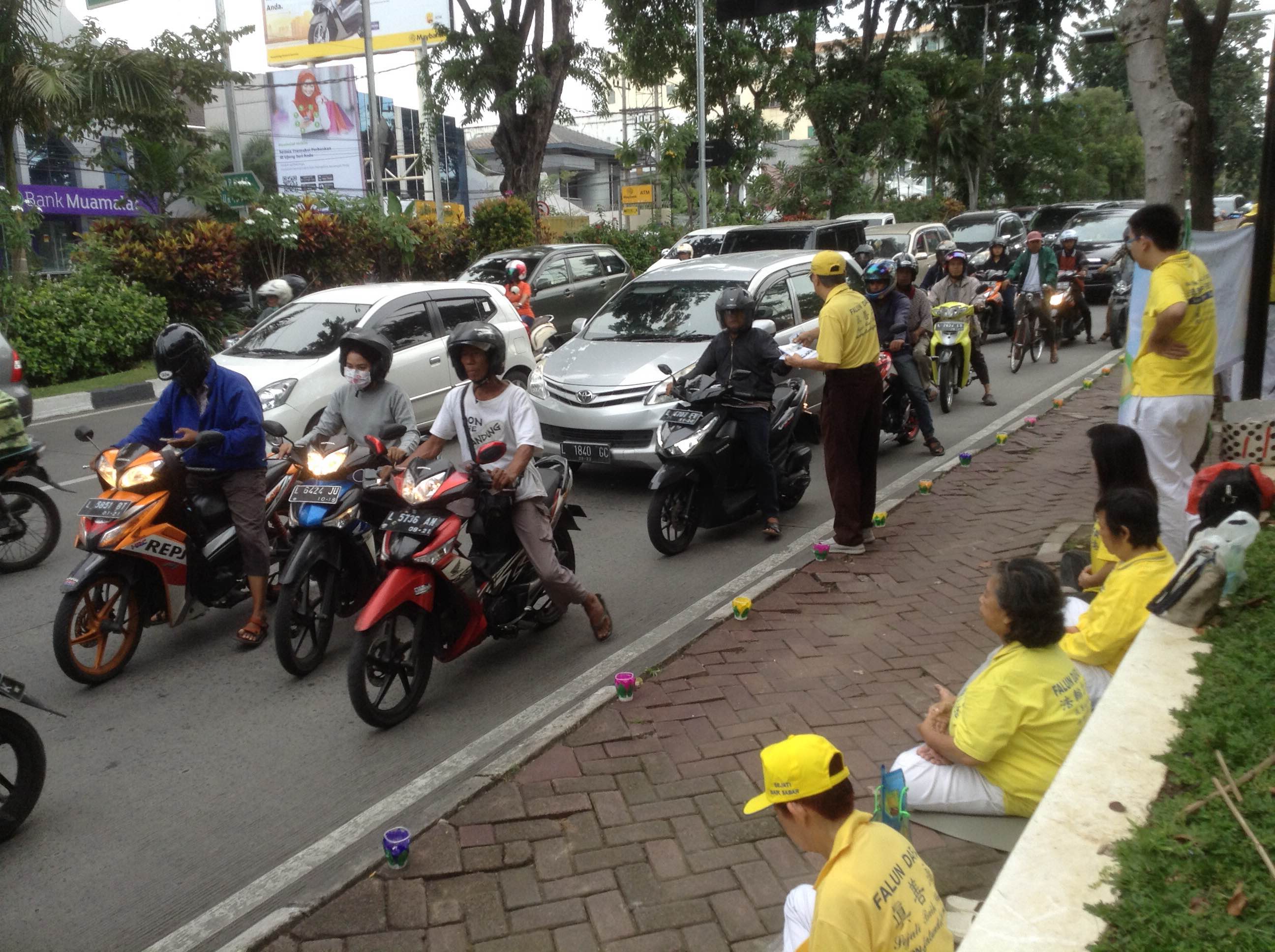 Meski cuaca panas dan hiruk pikuk lalu lintas yang melintas di hadapan praktisi, namun praktisi tidak terpengaruh sama sekali, mereka tetap nampak begitu hening dan khidmat. Sudah bukan hal baru lagi, jika ada warga yang mengabadikan aksi damai praktisi ini.