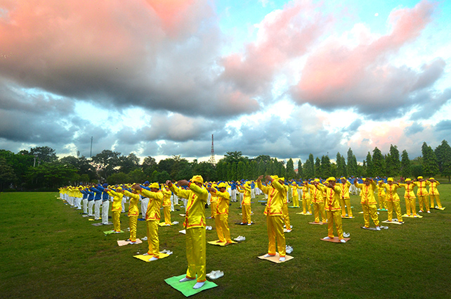Sebelum acara pawai dimulai, para praktisi melakukan latihan Falun Gong dari perangkat latihan 1 sampai 4.