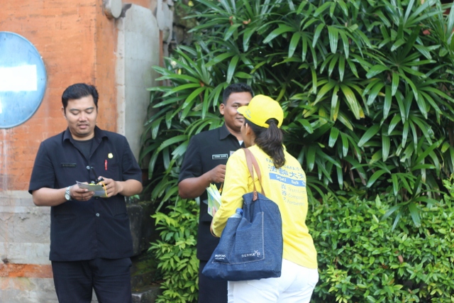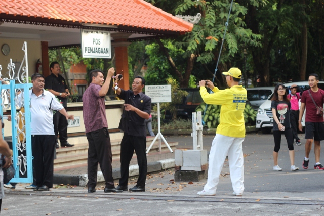 Penjaga keamanan kantor gubernur Bali menerima bunga lotus