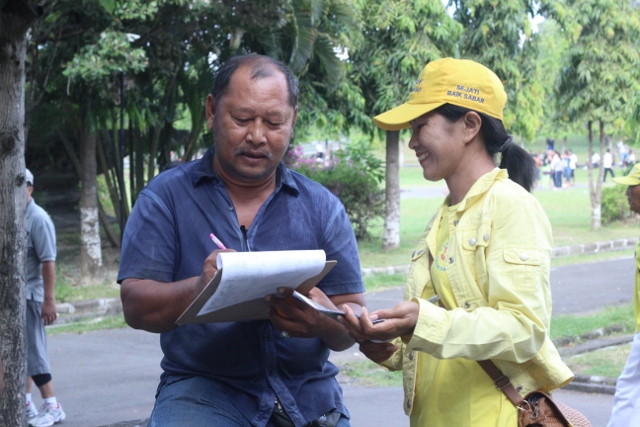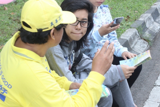 Beberapa praktisi membagikan brosur pengenalan Falun Dafa dan Tabloid Minghui serta mengumpulkan tanda tangan petisi “Melaporkan Kejahatan mantan Pemimpin Partai Komunis Tiongkok Jiang Zemin.”