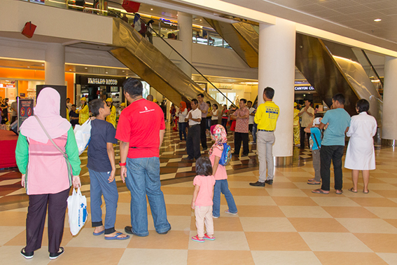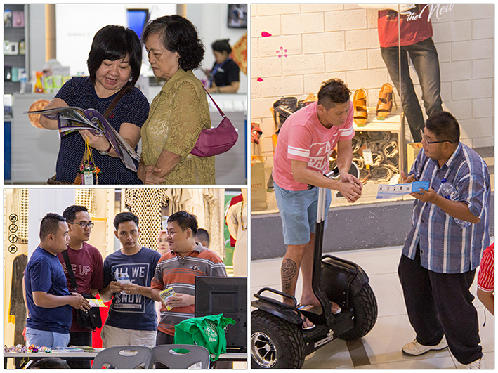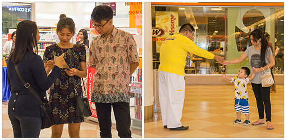 Praktisi membagikan brosur dan bunga lotus kepada pengunjung mall