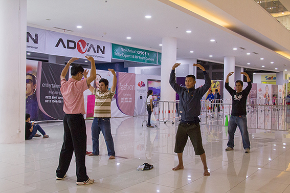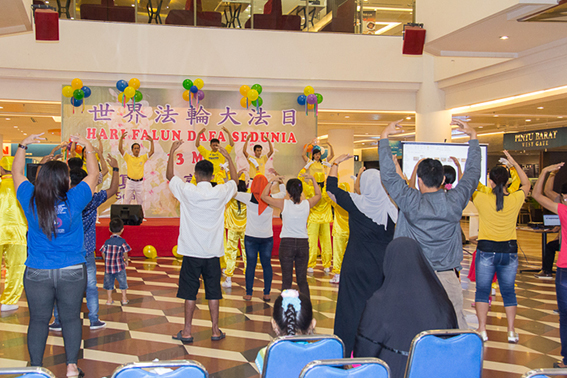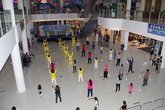 Beberapa pengunjung mall mempelajari latihan Falun Dafa