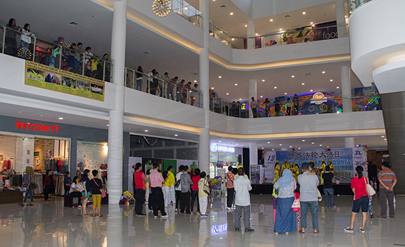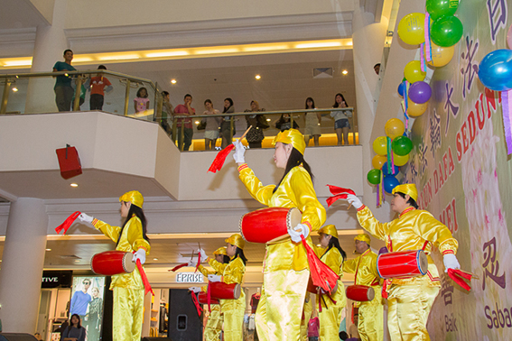 Barisan genderang pinggang praktisi Falun Dafa di Mega Mall, Batam Center