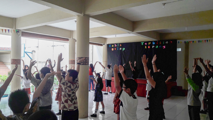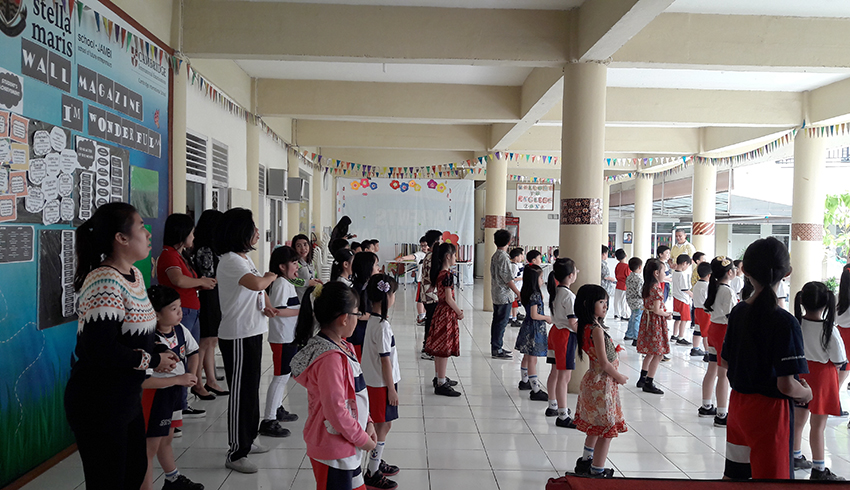 (Minghui.org) Pada hari Jumat, 2 Juni 2017, praktisi dari Provinsi Jambi untuk pertama kalinya memperkenalkan latihan Falun Dafa kepada para siswa SD Stella Maris. Praktisi memperagakan lima perangkat latihan Falun Dafa dan diikuti oleh para siswa dan guru. Seorang praktisi menjelaskan cara melakukan latihan dengan menggunakan pengeras suara.