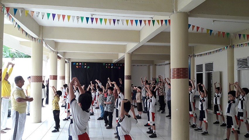 Praktisi Falun Dafa dari Provinsi Jambi memperkenalkan latihan Falun Dafa kepada para guru dan siswa SD Stella Maris