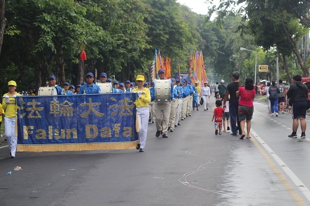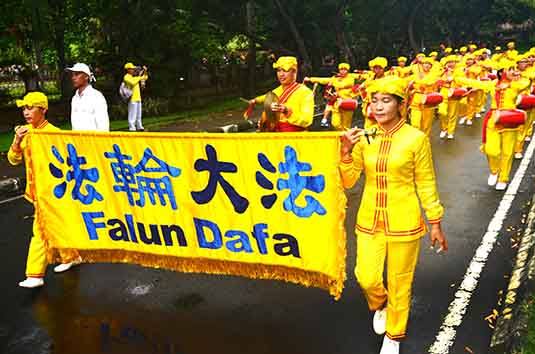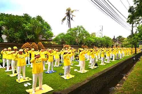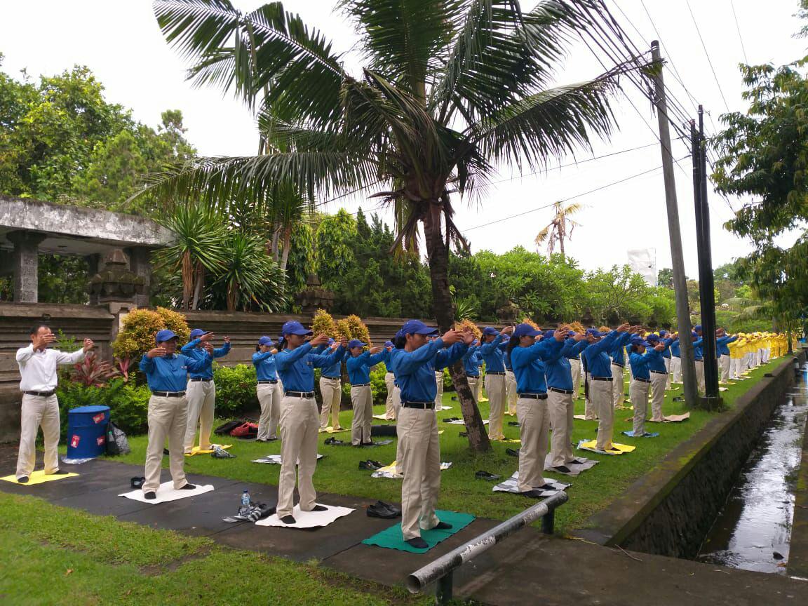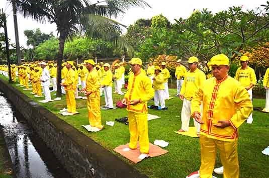 Walau hujan gerimis, para praktisi dari seluruh Bali dengan antusias menghadiri kegiatan mulai pukul 05.55, dimulai dengan latihan Falun Gong.