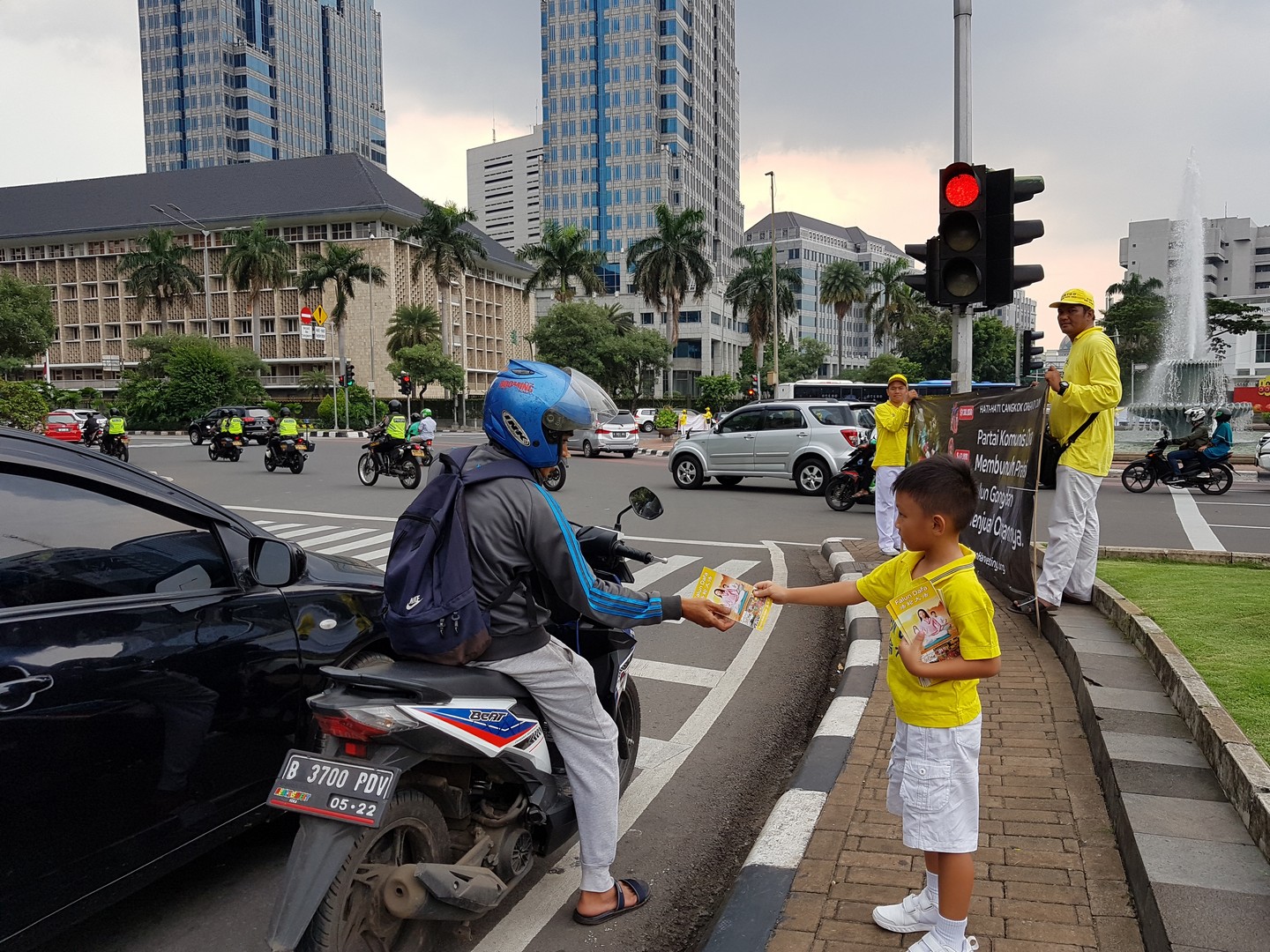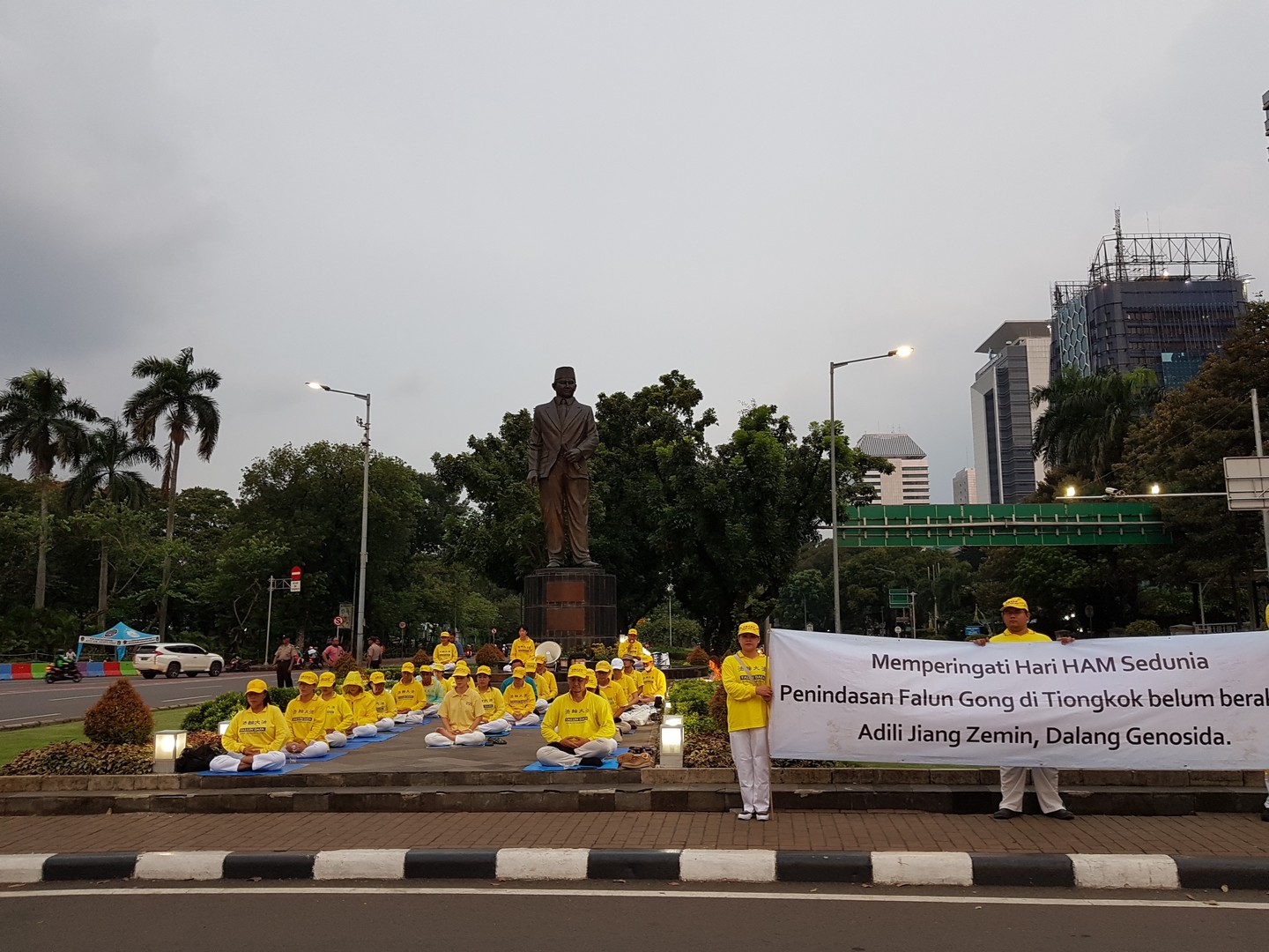 (Minghui.org) Pada Sabtu sore, 8 Desember 2018, menjelang peringatan tujuh puluh tahun Deklarasi HAM Universal -- para praktisi Falun Dafa di Jakarta mengadakan aksi damai berupa bentang spanduk yang menyerukan penghentian penganiayaan Partai Komunis Tiongkok (PKT) terhadap Falun Dafa (disebut pula Falun Gong). Lokasi kegiatan sore itu adalah Bundaran Patung Kuda, di seberang Monumen Nasional, yang merupakan persimpangan jalan besar yang ramai di pusat kota.