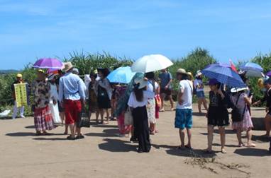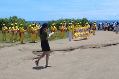 Kegiatan di pantai dimulai pukul 13.00-15.00 di tengah terik matahari. Kegiatan diisi pentas Genderang Pinggang, latihan bersama Falun Gong, serta memajang spanduk-spanduk yang menganjurkan agar menarik garis pemisah dari PKT dan organisasi pemudanya.