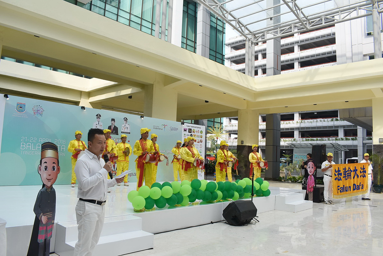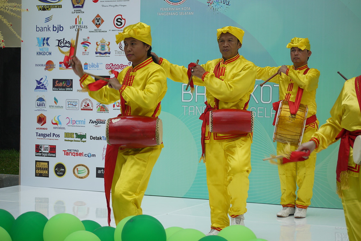 (Minghui.org) Pada tanggal 21 April 2018 pagi, Barisan Genderang Pinggang praktisi Falun Dafa diundang untuk membuka acara Pesta Rakyat UMKM (Usaha Mikro Kecil Menengah) Jalan Bersama di Balai Kota Tangerang Selatan.
