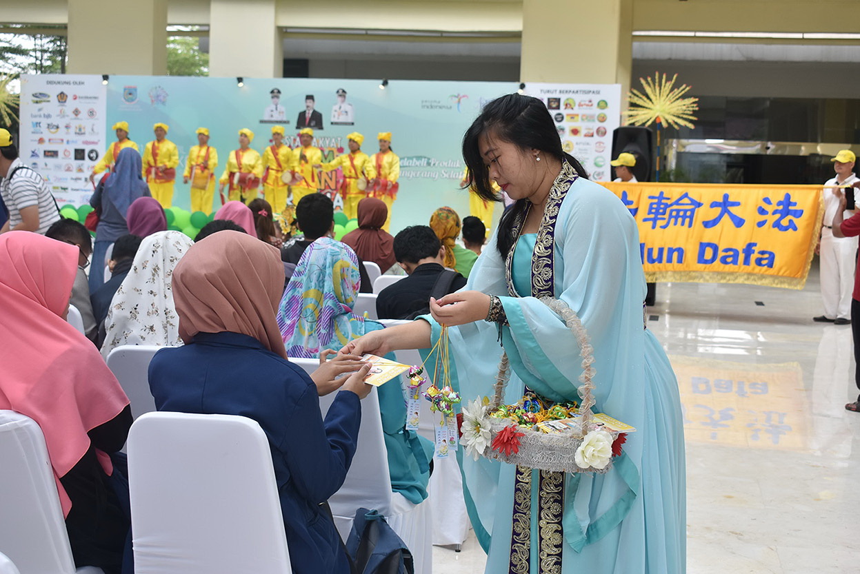 Dalam kesempatan tersebut, Barisan Genderang Pinggang memainkan 5 lagu termasuk “Falun Dafa Hao” (Falun Dafa baik). Sementara praktisi dalam kostum bidadari membagikan brosur maupun bunga lotus buatan tangan kepada para undangan.