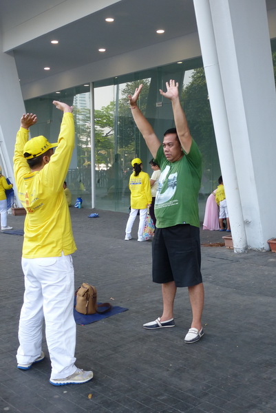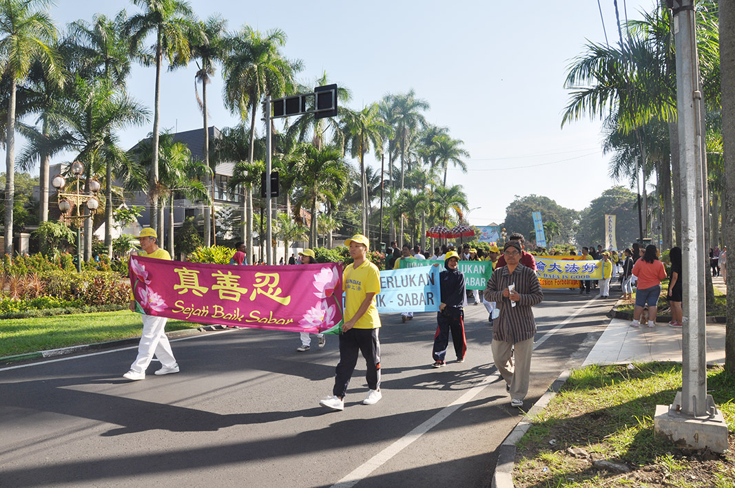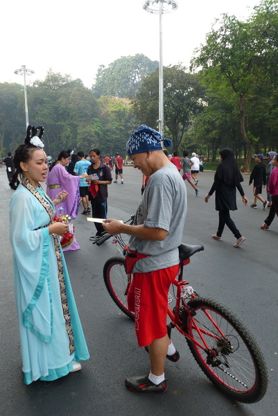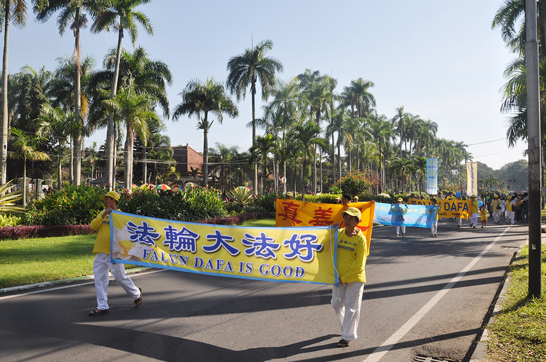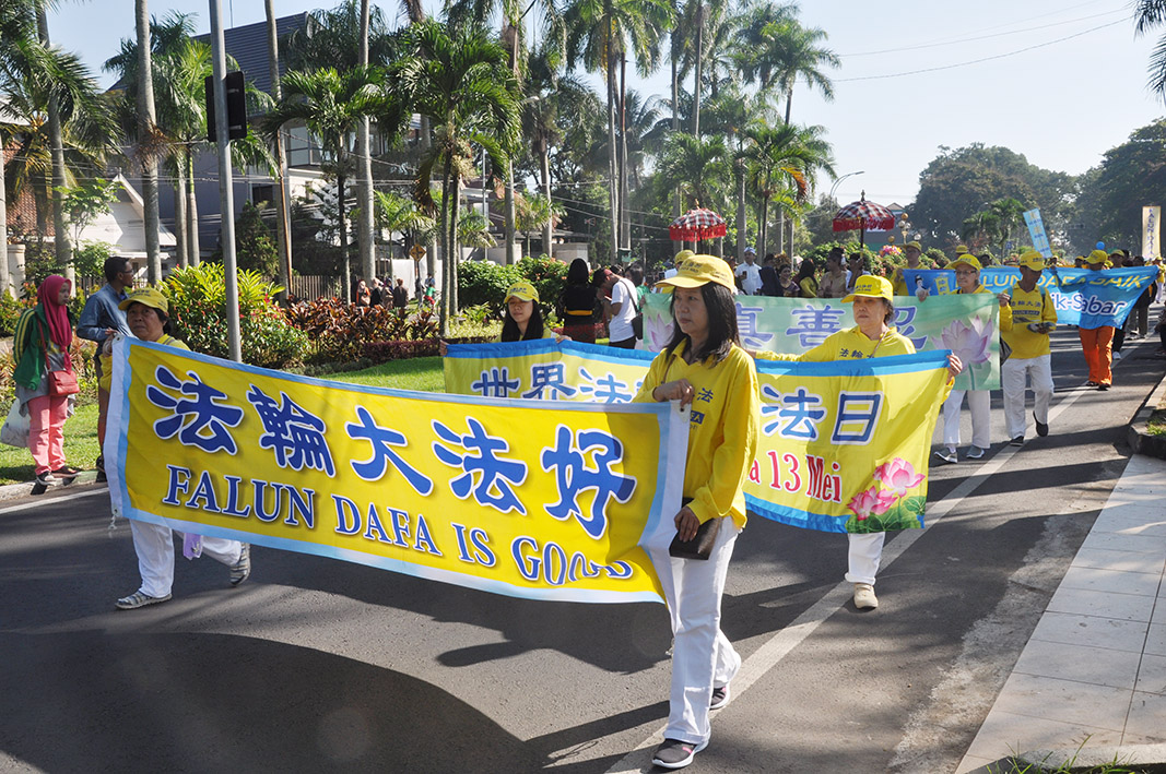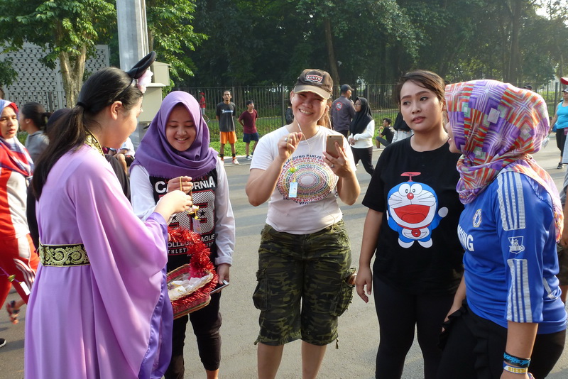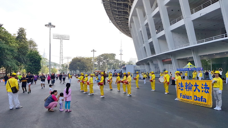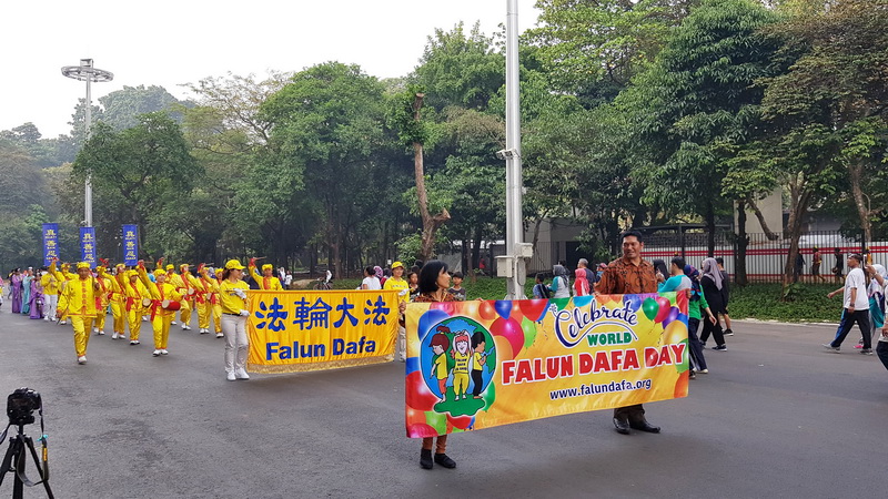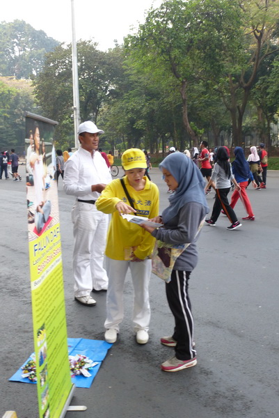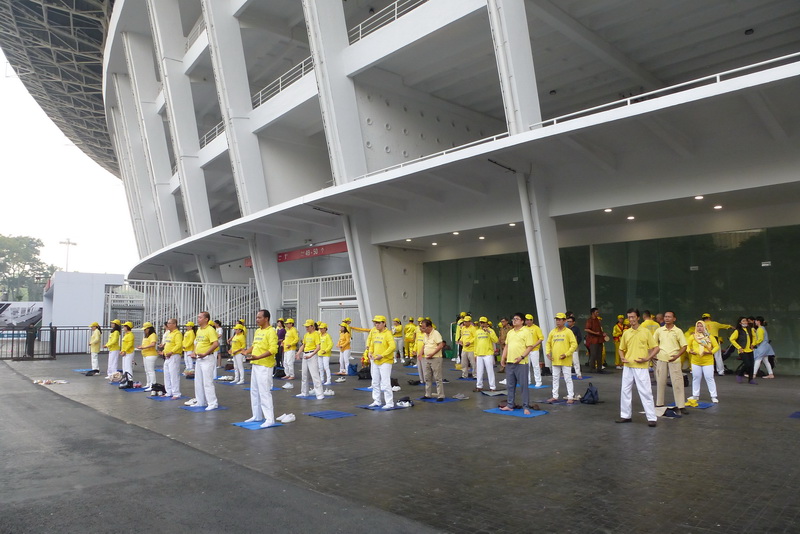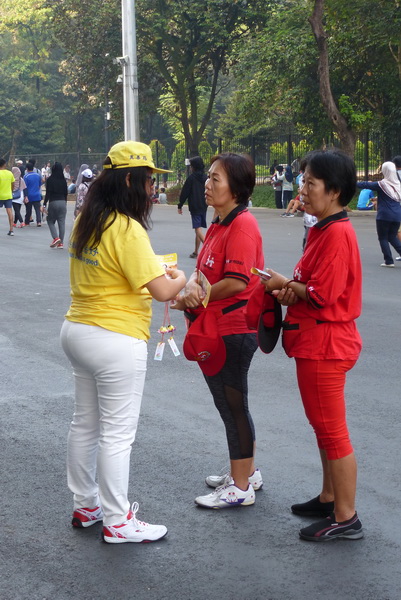 Kegiatan pagi hari di Jakarta diawali dengan latihan Falun Gong bersama, sementara Barisan Genderang Pinggang beserta Barisan Bidadari berkeliling di Jalan Lingkar Stadion GBK sebanyak dua putaran. Banyak anggota masyarakat yang tengah berolah raga pagi, langsung berhenti untuk mencoba perangkat latihan Falun Gong; menyambut hangat barisan genderang pinggang maupun bidadari, berfoto bersama dan meminta bunga lotus kertas serta brosur pengenalan Falun Dafa yang dibawa praktisi berkostum bidadari.