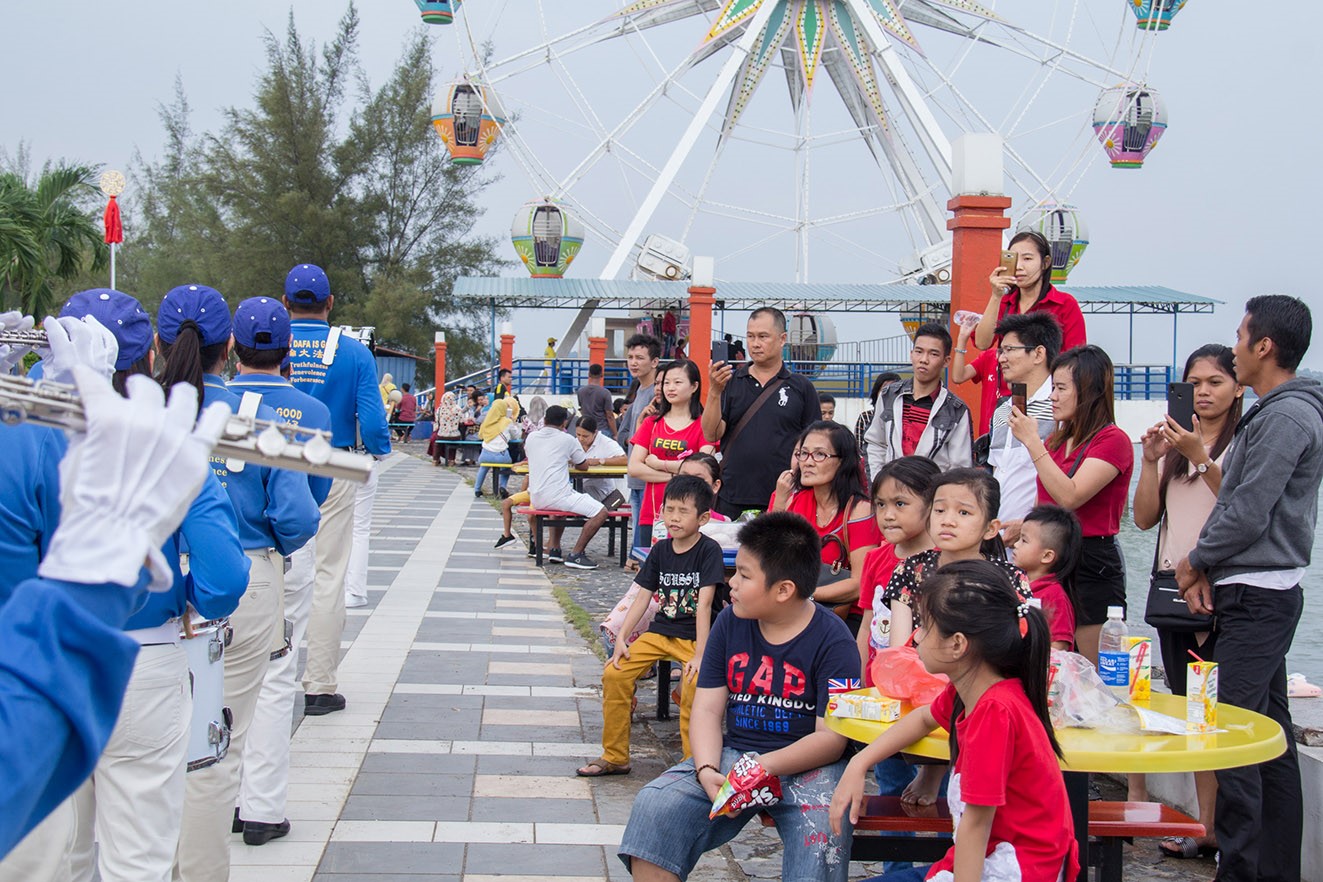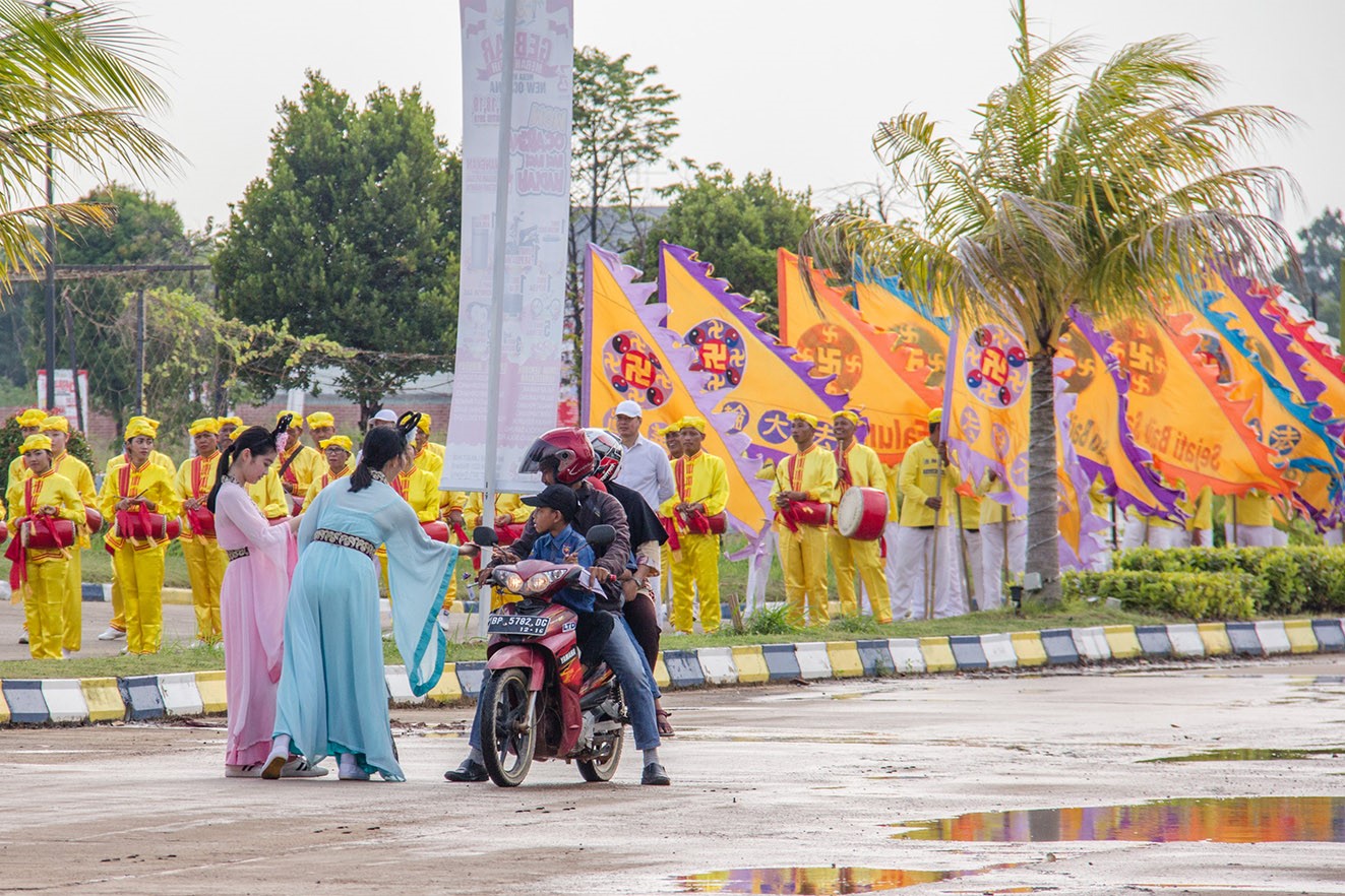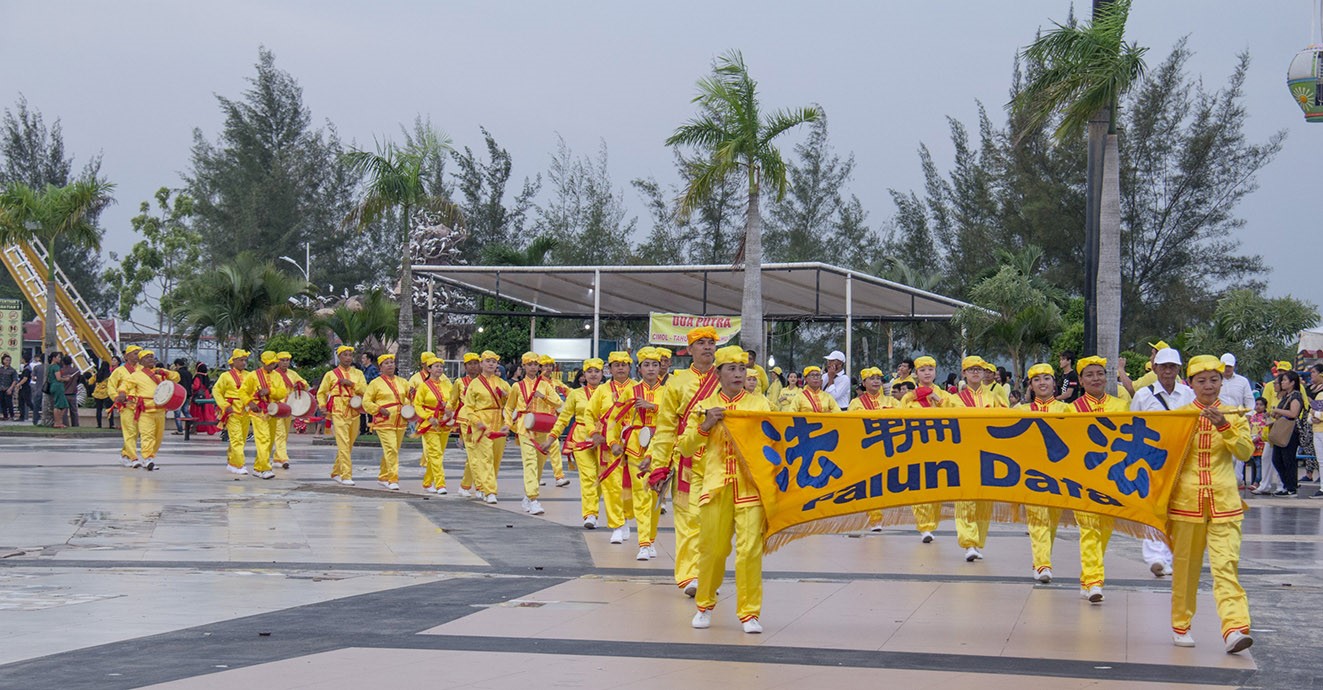 Sekitar pukul 3.30 sore, ratusan praktisi telah berkumpul dengan tertib di beberapa titik di dalam kawasan wisata Ocarina, terbagi menjadi tiga grup besar. Grup pertama memperkenalkan latihan Falun Gong kepada para pengunjung, sementara grup kedua adalah Barisan Genderang Pinggang, dengan kostum kuning emas yang menjadi ciri khasnya berkeliling di kawasan, menyampaikan keindahan Falun Dafa kepada para pengunjung. Grup besar ketiga adalah Tian Guo Marching Band yang dengan komposisi berbagai instrumen musiknya telah menarik sejumlah besar pengunjung untuk datang menyaksikan.