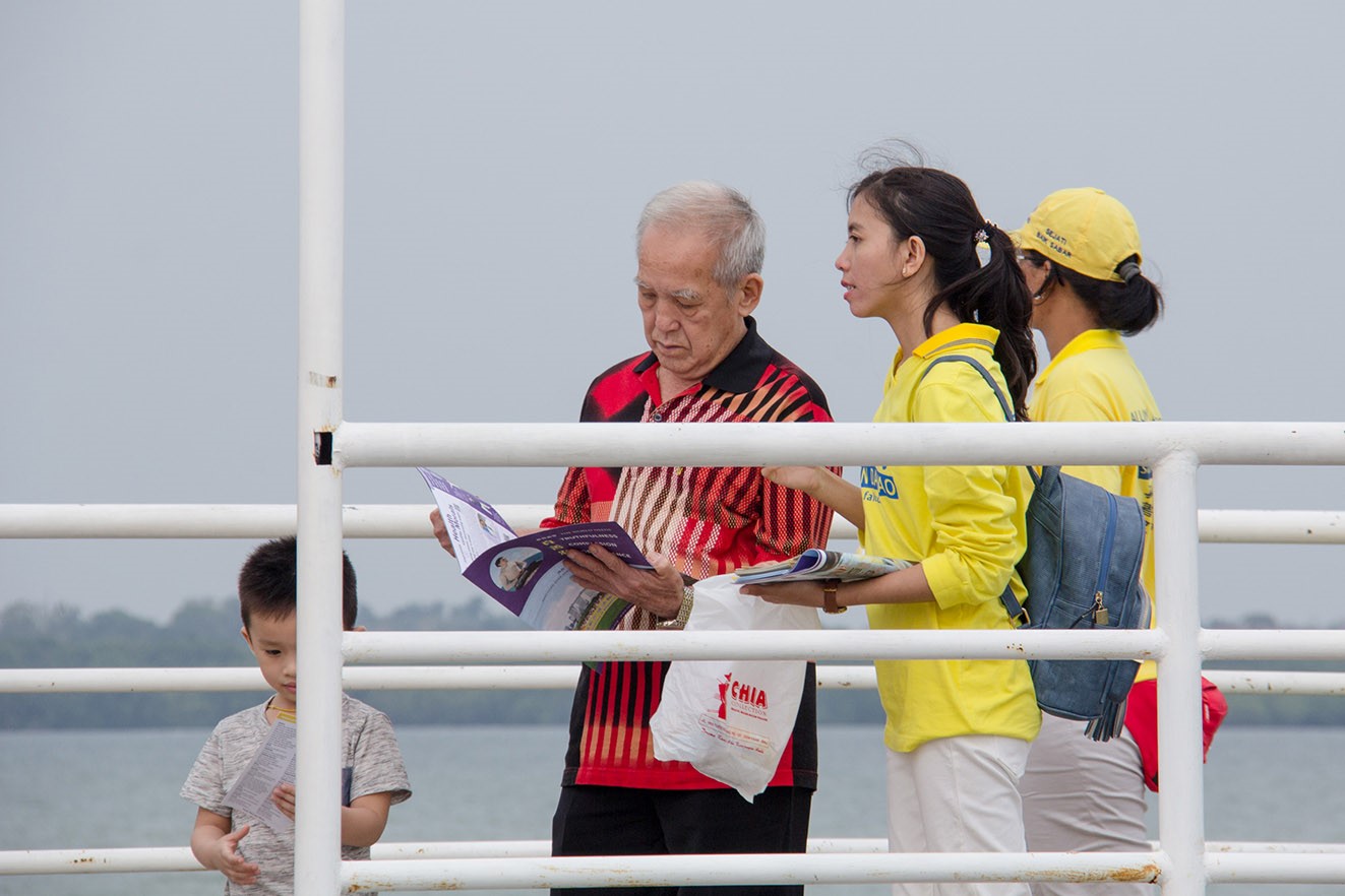 Beberapa praktisi berdiri di sekitar lokasi peragaan latihan Falun Gong, membagikan brosur dan memperkenalkan Dafa kepada para pengunjung dan menjelaskan fakta-fakta dasar lainnya.
