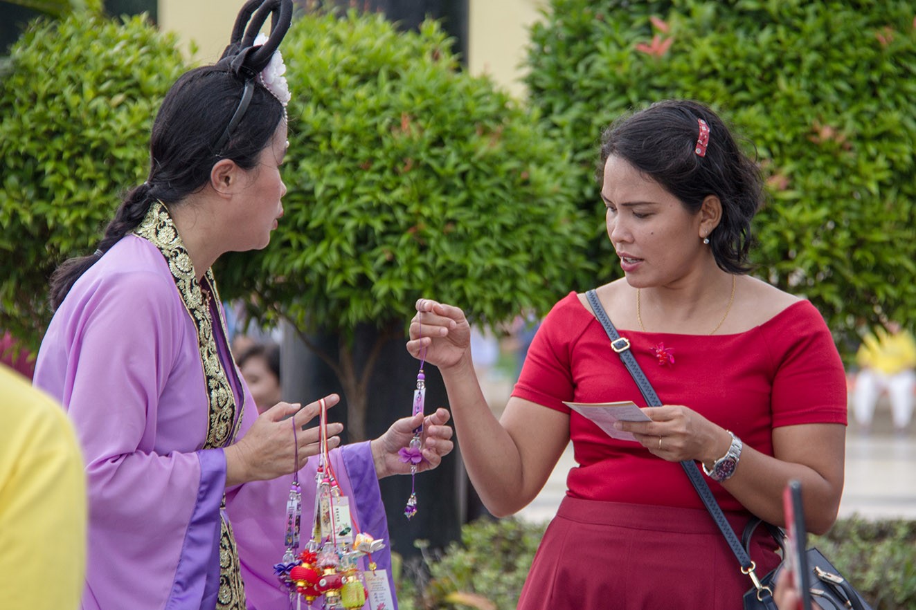 Sejumlah praktisi dalam kostum bidadari tidak ketinggalan membagikan brosur dan bunga lotus kertas buatan tangan para praktisi, yang menyampaikan pesan kebaikan dari Falun Dafa serta prinsip dasarnya Sejati-Baik-Sabar. Banyak pengunjung keluarga dengan gembira menerima hadiah yang indah tersebut.