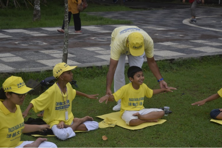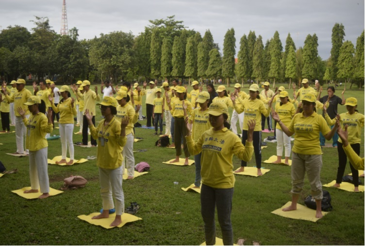 Peserta Kamp Sekolah Minghui di Bali 2018 saat bermeditasi di Lapangan Renon, Denpasar pada hari Sabtu, 29 Desember 2018