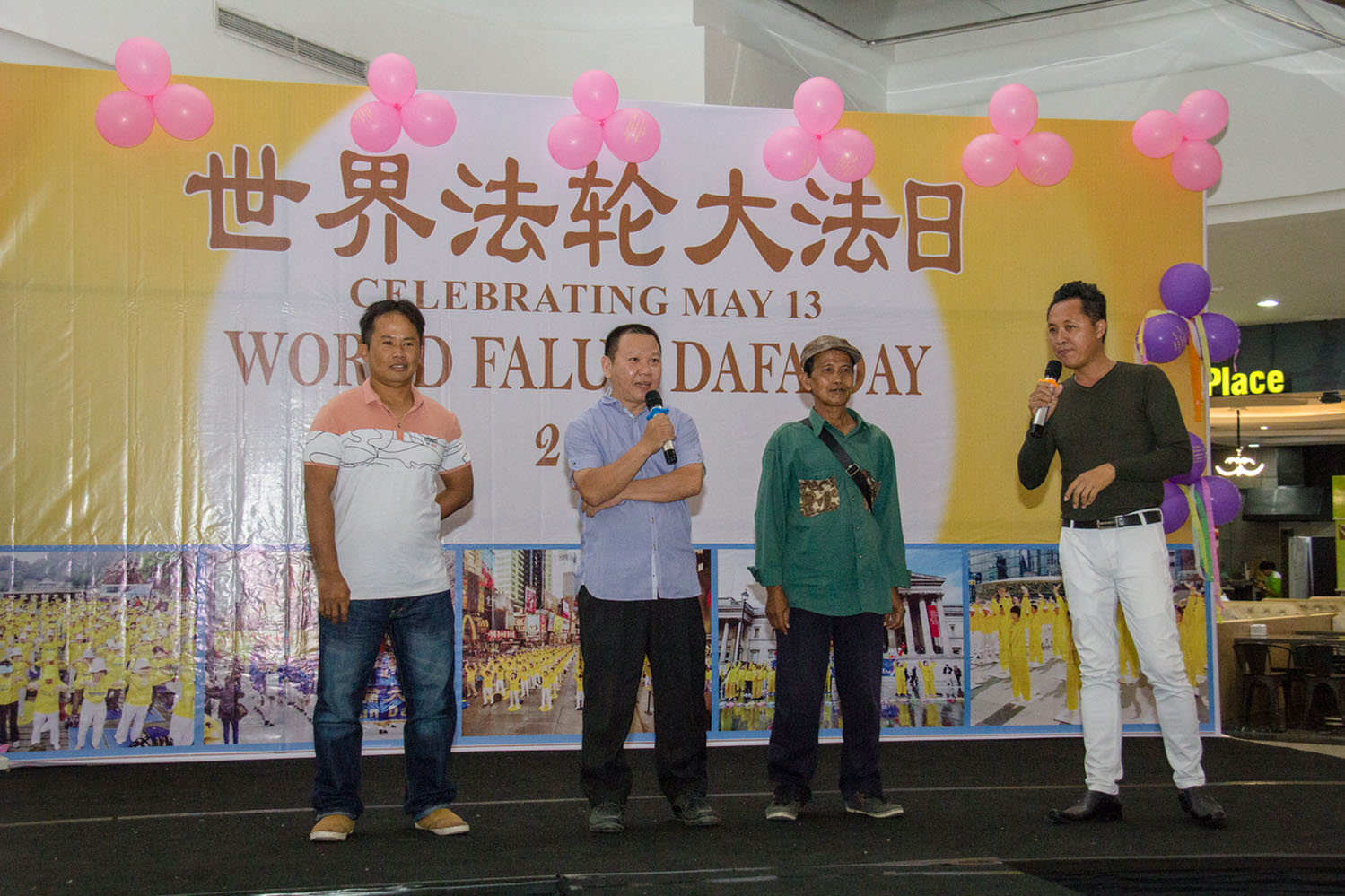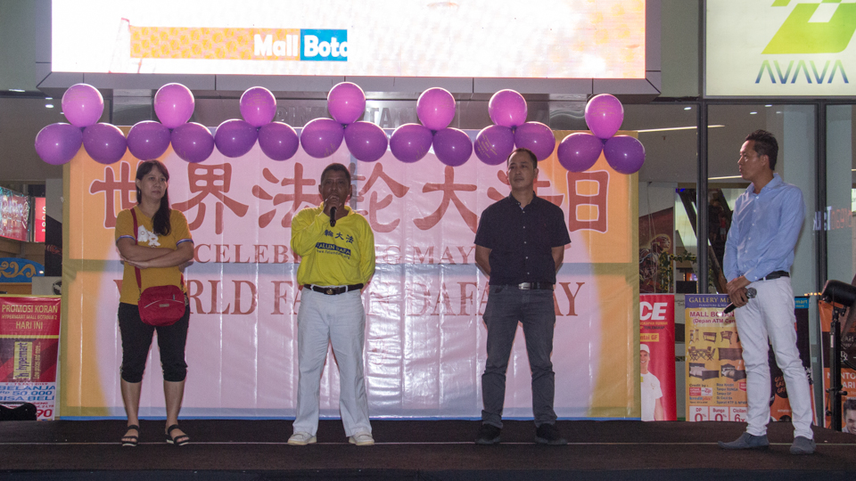 Dedi Lim (tengah, pegang mikrofon) menceritakan pengalamannya setelah berlatih Falun Dafa