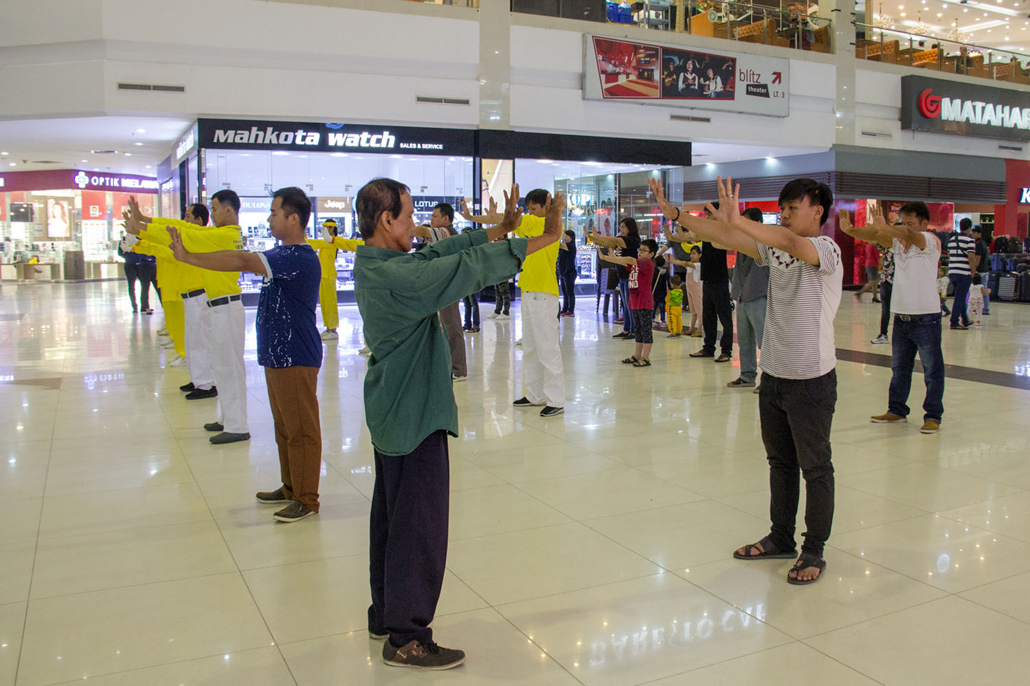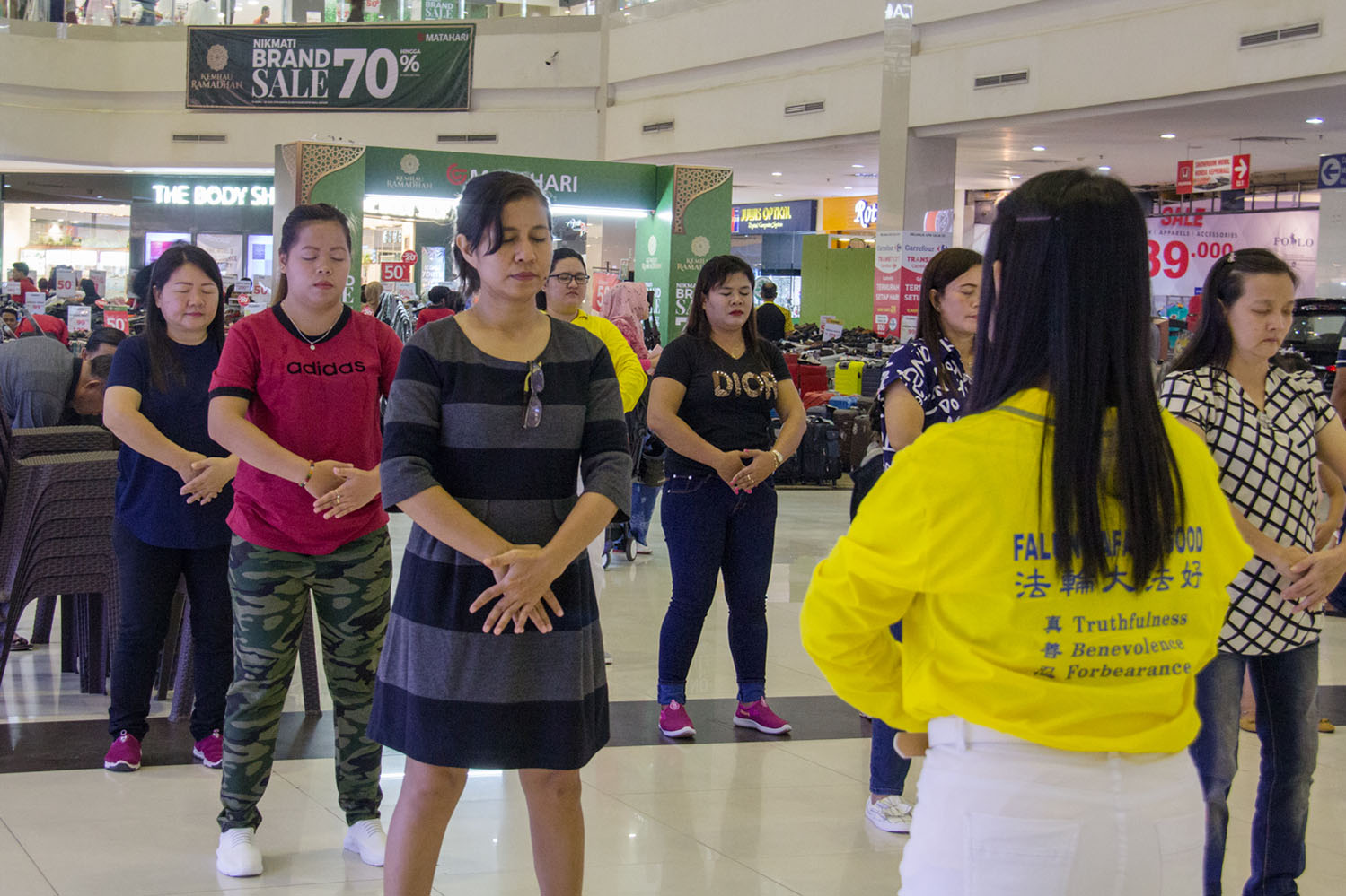 Beberapa pengunjung mal ikut mempelajari latihan Falun Dafa