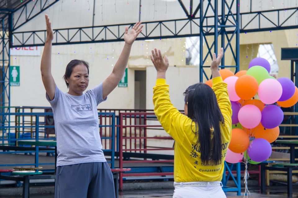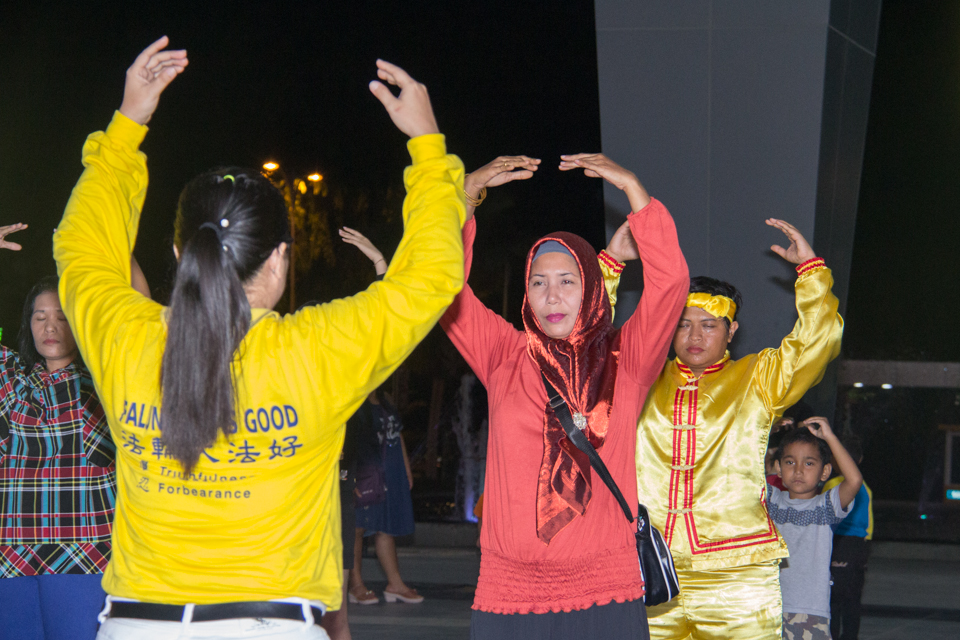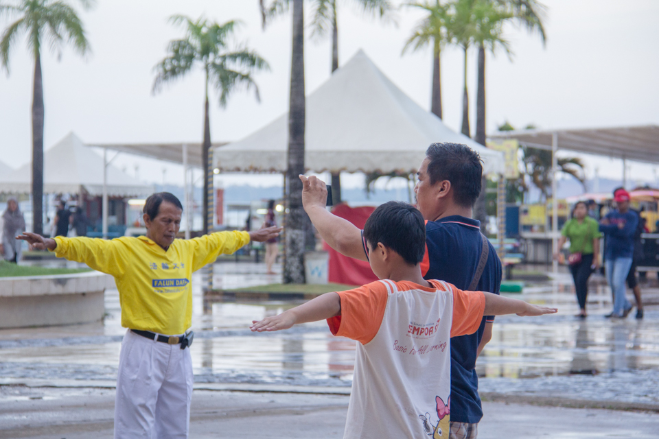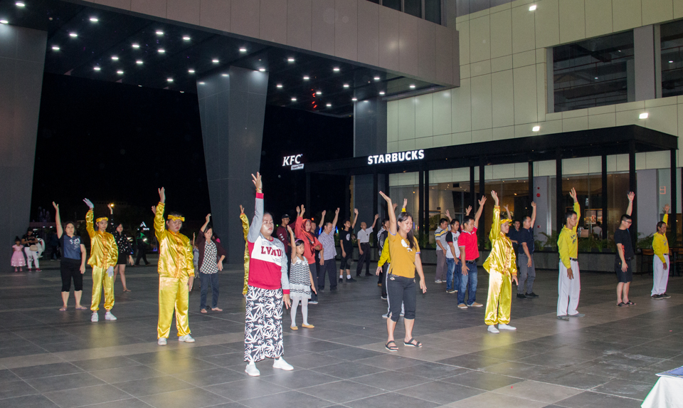 Beberapa pengunjung ikut berlatih Falun Dafa