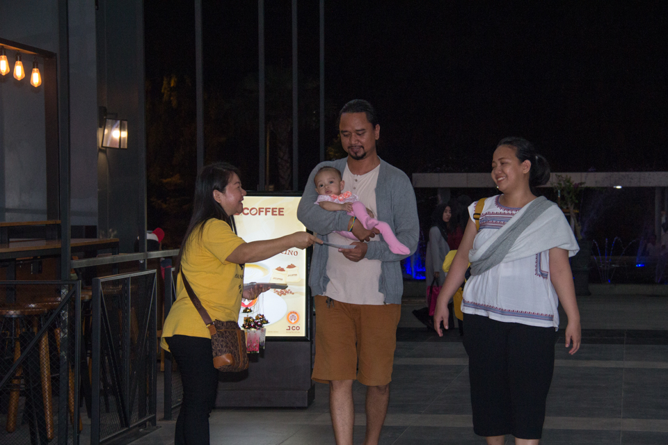 Praktisi membagikan brosur dan bunga lotus kertas kepada pengunjung mal