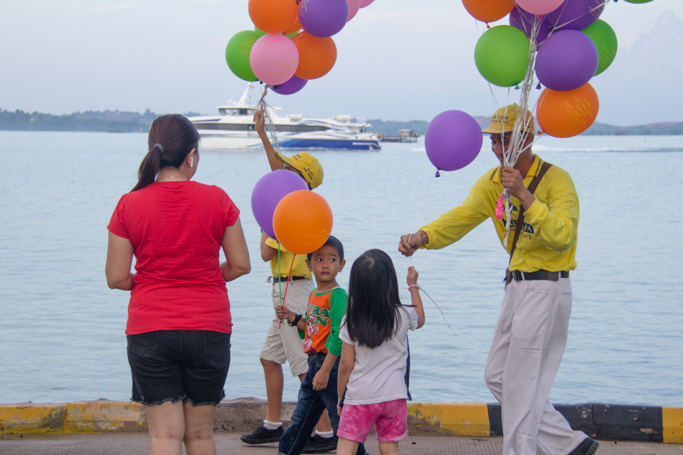 Seorang praktisi membagikan balon warna kepada anak kecil