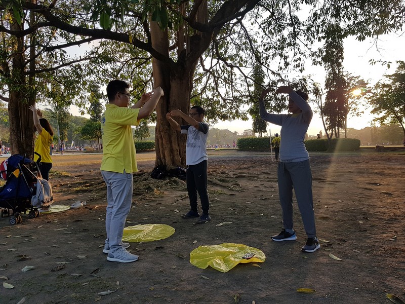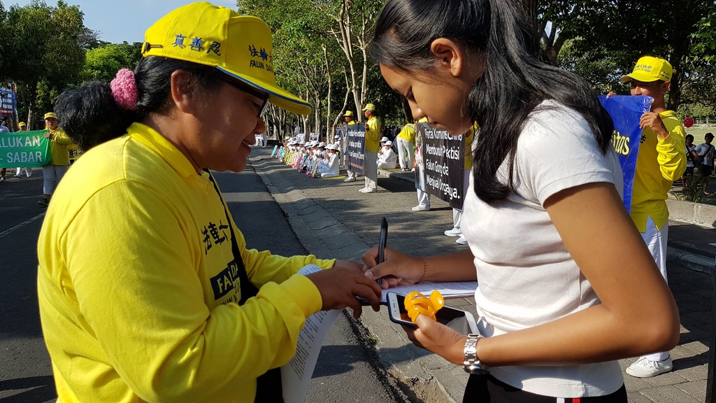 Sementara itu beberapa orang yang melintas di lokasi kegiatan, berhenti untuk mempelajari perangkat latihan Falun Gong.