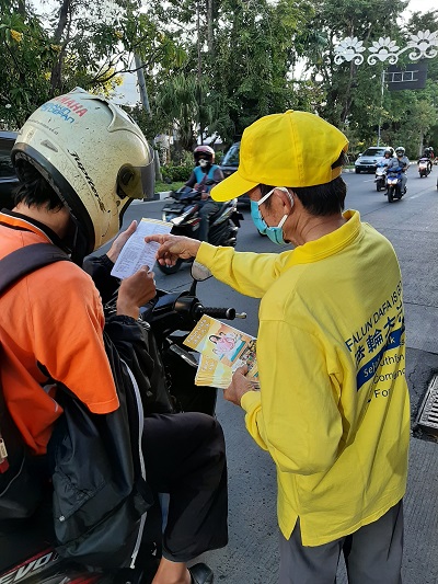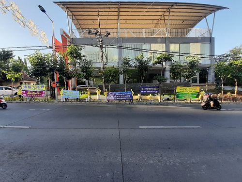 (Minghui.org) Kondisi Surabaya yang saat ini tercatat sebagai rekor tertinggi di Indonesia dalam hal infeksi virus corona (Virus PKT) tidak menyurutkan langkah praktisi Surabaya dan sekitarnya untuk menggelar aksi damai memperingati 21 tahun penindasan Partai Komunis Tiongkok (PKT) terhadap praktisi Falun Dafa di Tiongkok. Aksi digelar di seberang konsulat RRT di Jalan Mayjen Sungkono pada Sabtu sore, 18 Juli 2020. Puluhan praktisi Falun Gong berjajar rapi dan tertib di seberang konsulat, mengenakan pakaian kuning dan putih dengan membentangkan spanduk-spanduk yang menyampaikan berbagai pesan, antara lain: “PKT Membunuh Hampir Seratus Juta Orang. Langit Memusnahkan PKT”, “Roh Jahat Komunisme Sedang Menguasai Dunia Menghancurkan Umat Manusia, Harapan Tunggal untuk Selamat adalah Meningkatkan Moral dan Balik ke Tradisi”, “Falun Dafa Baik, Sejati-Baik-Sabar Baik”.