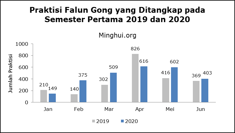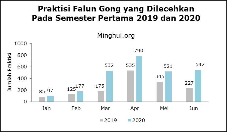 Meskipun kebanyakan provinsi di Tiongkok ditutup beberapa bulan di awal tahun 2020, lebih banyak praktisi yang diganggu setiap bulan pada tahun 2020 dari pada periode yang sama di tahun 2019. Juga terdapat lebih banyak praktisi yang ditangkap pada bulan Februari, Maret dan Juni tahun 2020 dibandingkan dengan tahun lalu.