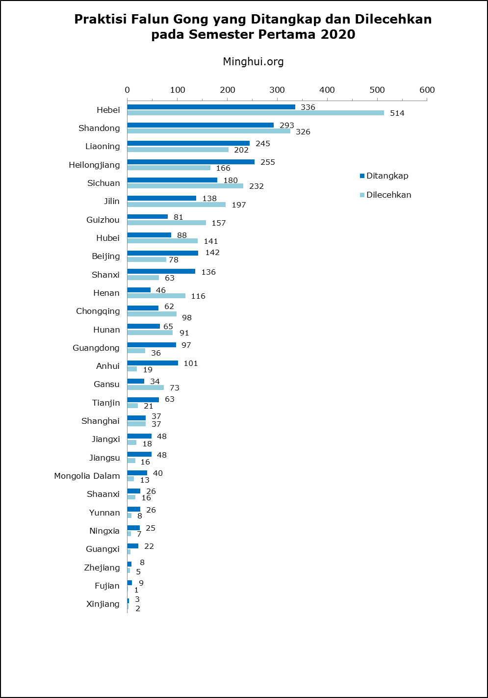 (Minghui.org) Di tengah pandemi virus Corona, Partai Komunis Tiongkok (PKT) meningkatkan penganiayaan Falun Gong pada setengah tahun pertama tahun 2020, di mana tercatat 2.654 praktisi ditangkap dan 2.659 praktisi diganggu karena keyakinan mereka. Di antara praktisi ini, rumah 1.687 praktisi digeledah. Pada waktu penulisan artikel ini, 1.246 praktisi, 47% dari yang ditangkap masih dalam penahanan.