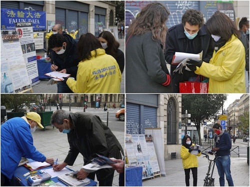 (Minghui.org) Praktisi Falun Dafa di Paris mengadakan kegiatan di Place de la République, Chinatown, dan Centquatre pada 26 Desember 2020, dan 3 Januari 2021. Mereka melakukan latihan, berbicara kepada orang-orang tentang manfaat dari latihan. dan 21 tahun penganiayaan terhadap Dafa oleh Partai Komunis Tiongkok (PKT), dan mengumpulkan tanda tangan pada petisi yang menyerukan diakhirinya PKT. Beberapa orang menandatangani petisi dan banyak yang benar-benar berminat untuk belajar Falun Dafa. Beberapa belajar latihan di tempat selama acara berlangsung.
