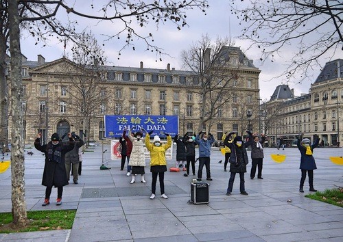 Para praktisi memperagakan latihan Falun Dafa pada 3 Januari 2021, di Place de la République.