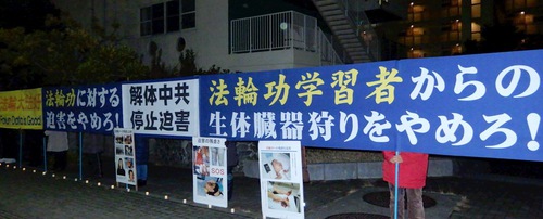 Stasiun Nagoya adalah salah satu daerah paling makmur di kota. Praktisi mengangkat spanduk di kedua pintu keluar stasiun kereta. Praktisi juga membagikan brosur dan mengumpulkan tanda tangan petisi yang menyerukan mantan diktator Jiang untuk dibawa ke pengadilan.
