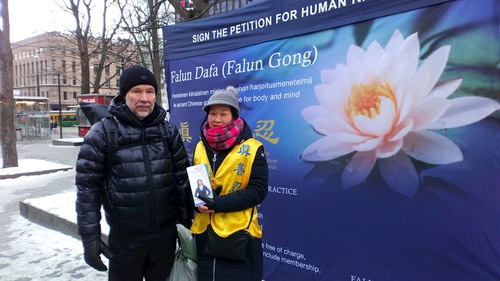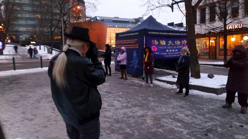 Dr. Tapani Vuola menyapa praktisi setelah dia keluar dari toko, “Tahukah anda bahwa Helsinki dan Beijing adalah kota kembar? Anda harus memberi tahu pemerintah Helsinki bahwa Beijing melanggar hak asasi manusia dan mereka tidak boleh menjadi kota kembar. Anda harus berbicara dengan anggota Parlemen Finlandia.