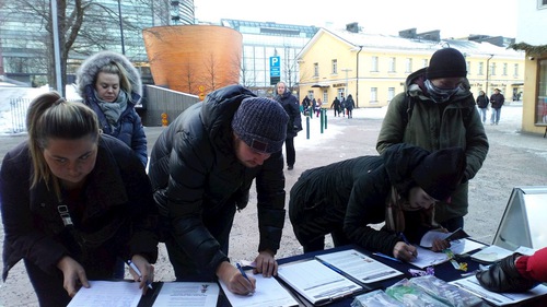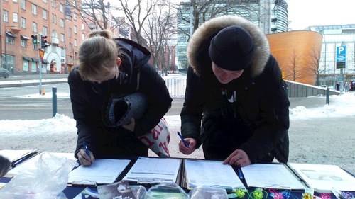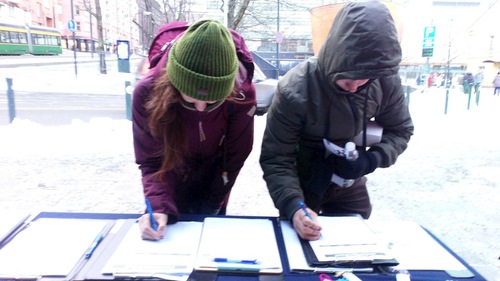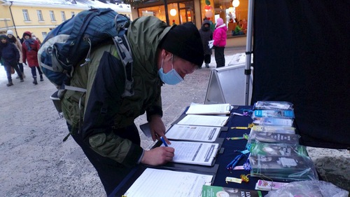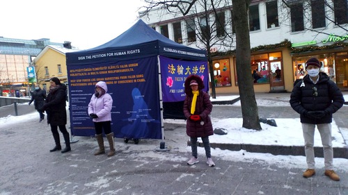 (Minghui.org) Praktisi Falun Gong sering terlihat di dekat Kamppi di Helsinki, memperkenalkan latihan dan meningkatkan kesadaran atas penganiayaan yang berlangsung hampir 22 tahun terhadap Falun Gong di Tiongkok. Praktisi mengadakan acara di tahun baru selama akhir pekan tanggal 9 Januari 2021, dengan berbicara kepada orang yang lewat tentang manfaat kesehatan dari Falun Gong, meditasi dan latihan spiritual yang pertama kali diajarkan di Tiongkok pada tahun 1992. Mereka juga mengungkap penganiayaan yang sedang berlangsung terhadap latihan ini di Tiongkok, dan Partai Komunis Tiongkok (PKT) memenjarakan dan menyiksa praktisi yang menolak untuk melepaskan keyakinannya.