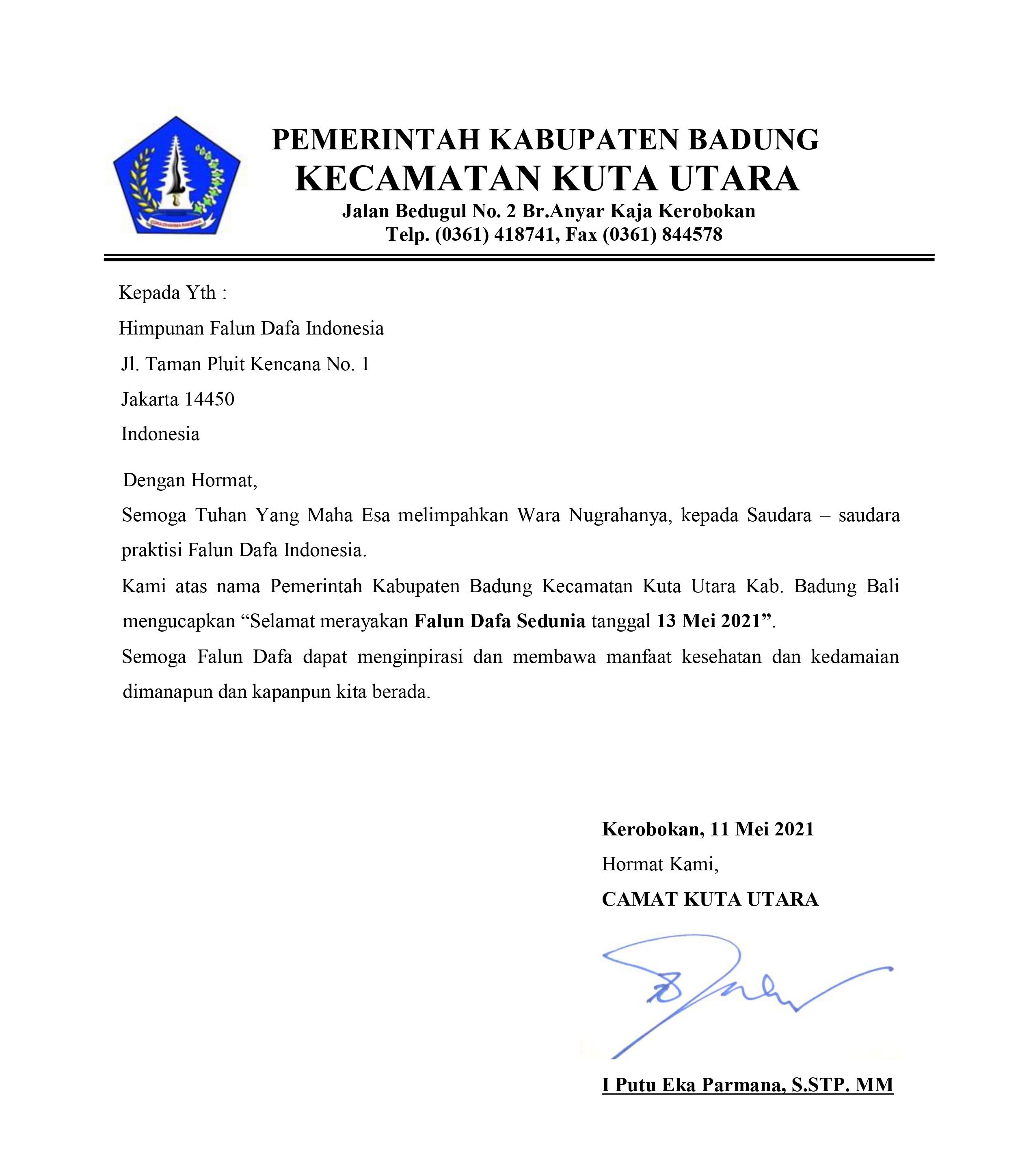 Kami atas nama Pemerintah Kabupaten Badung Kecamatan Kuta Utara Bali mengucapkan “Selamat merayakan Falun Dafa Sedunia tanggal 13 Mei 2021”.