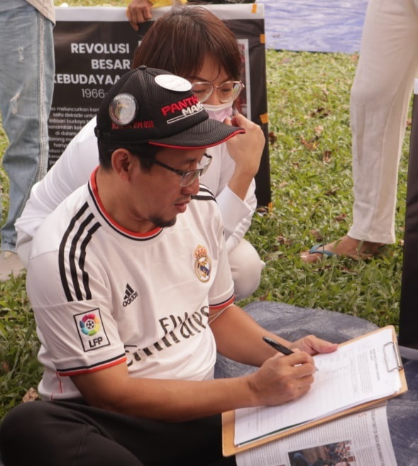 Pengunjung taman membaca brosur klarifikasi dan menandatangani petisi untuk menghentikan penganiayaan