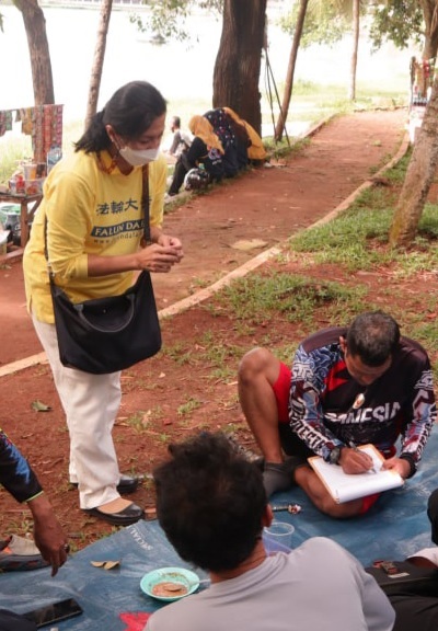 Selain memperkenalkan perangkat latihan, praktisi juga menyebarkan brosur pengenalan Falun Dafa kepada para pengunjung taman. Sementara beberapa praktisi lainnya mengumpulkan petisi tandatangan untuk menyerukan penghentian penganiayaan terhadap Falun Dafa di Tiongkok daratan.