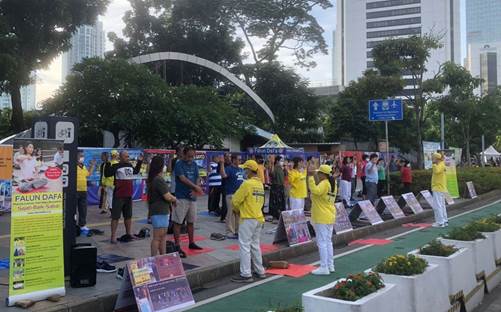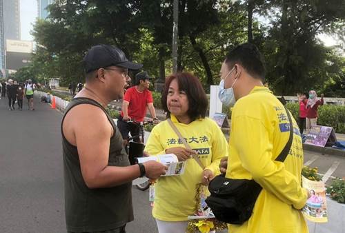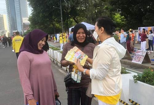 Warga Jakarta berhenti dan berbincang-bincang dengan praktisi untuk memahami fakta tentang Falun Dafa