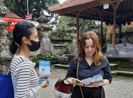 Daerah sekitar Puri Agung Ubud menjadi favorit wisatawan yang ingin menikmati keindahan arsitektur tradisional Bali. Sepasang wisatawan muda asal Rusia dan Ukraina berpapasan dengan praktisi muda dan mereka mulai berbincang-bincang. Setelah mengetahui informasi latihan Falun Dafa, salah satu dari mereka tertarik untuk mengetahui tempat latihan yang dapat mereka kunjungi. Praktisi kemudian menjelaskan fakta pengambilan organ paksa dari praktisi Dafa secara hidup-hidup yang dilakukan Partai Komunis Tiongkok (PKT).