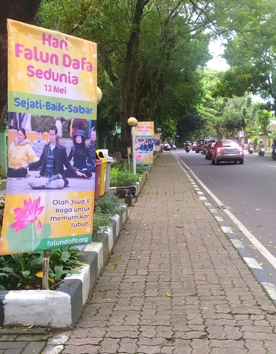 Spanduk-spanduk perayaan Hari Falun Dafa Sedunia terpasang di tepi jalan-jalan utama di Kota Malang (13/5)