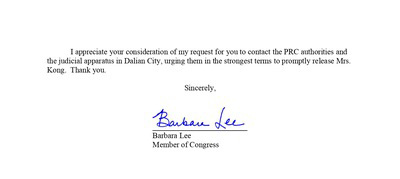 Anggota Kongres Lee menulis, “Saya memiliki keprihatinan mendalam mengenai kesejahteraan Kong selama dia dikurung oleh otoritas Republik Rakyat Tiongkok (RRT). Oleh karena itu, saya mendesak Anda untuk meminta Duta Besar Nicholas Burns untuk mengangkat kasus ini secara langsung kepada rekan-rekannya di RRT dan menyerukan pembebasan Kong segera tanpa syarat.”